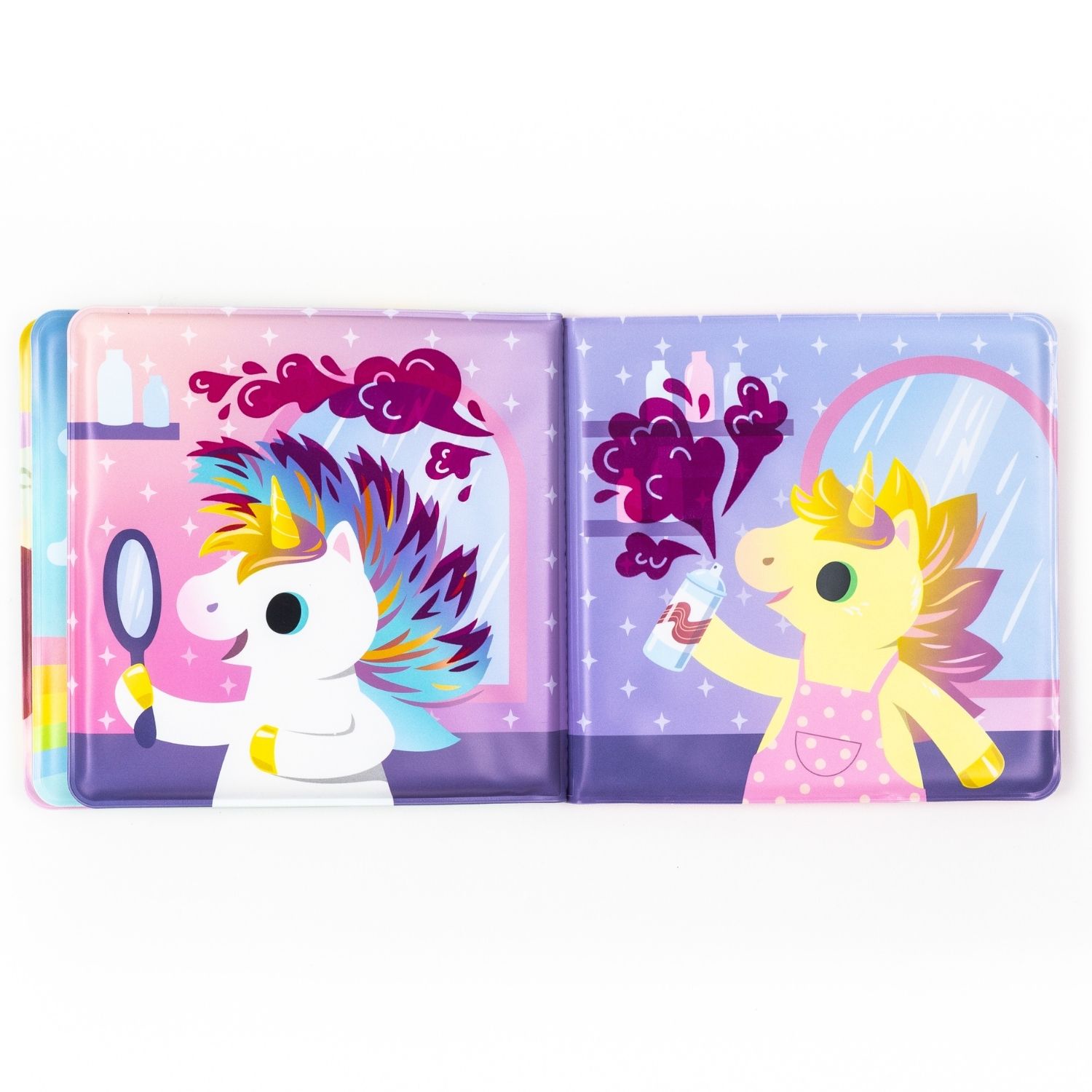 Livre de bain mignon et illustré avec de la « boue » magique sur le thème des licornes. Regardez la « boue » disparaître avec l’eau chaude et réapparaître avec l’eau froide.