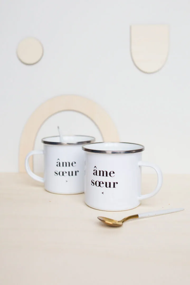 Ce lot de deux tasses avec anses en émail, avec l’inscription « Âme sœur », est parfait pour partager un réveil en douceur ou une pause café dans la journée en amoureux. Complémentaires mais libres, ces tasses « âmes soeurs » sont le parfait présent pour la St Valentin ou pour célébrer une date de rencontre ou un anniversaire de mariage ! L’impression est visible sur une face Dimension : 8cm de diamètre – 300ml env. de contenance Matière : émail Fabrication : 3 jours ouvrés Livraison : 48H en colissimo