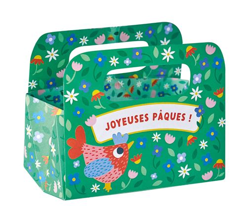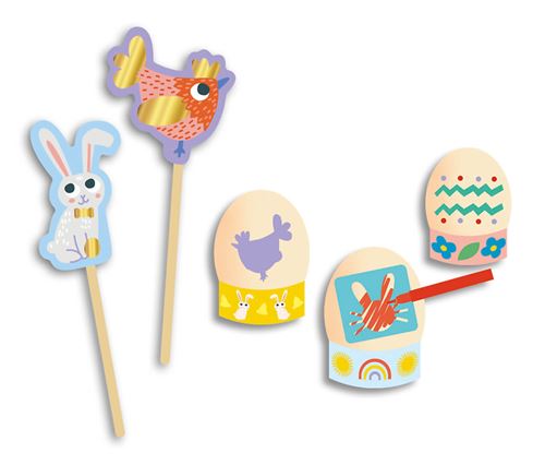 Elle propose des pochoirs autocollants et des feutres pour décorer des œufs, un joli panier pour y mettre les chocolats, des autocollants brillants et des décorations à planter pour mettre sa maison au goût de la fête du chocolat !