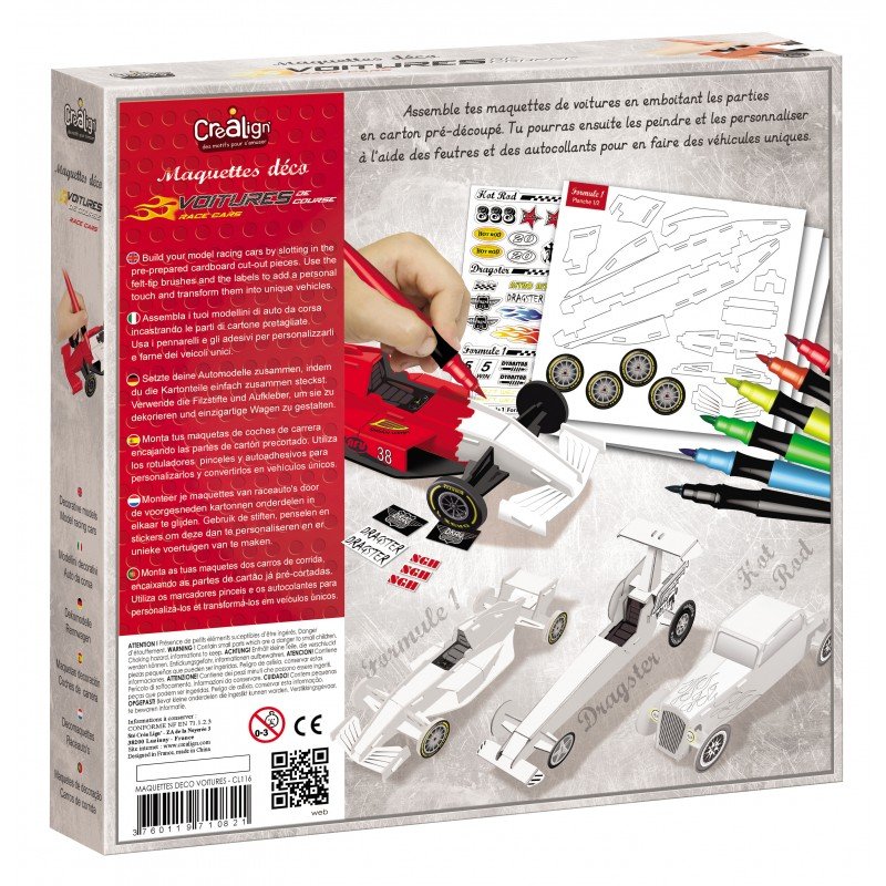 A tous les passionnés de voitures de course! Grâce à ce coffret les enfants pourront emboiter les parties en carton prédécoupées. Ensuite ils pourront les peindre et les personnaliser à l’aide des feutres et des autocollants fournis pour créer des modèles uniques !