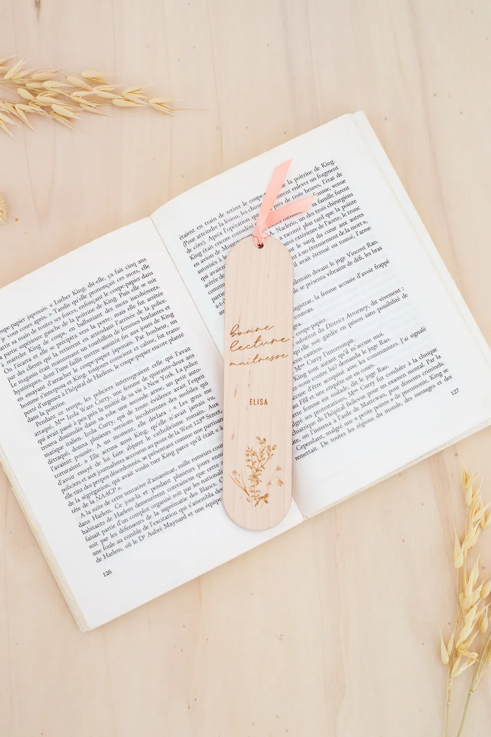 Un marque page en bois tout en délicatesse avec sa gravure de fleurs sauvages et son petit noeud de satin rose. « Bonne lecture Maîtresse » est à personnaliser avec le prénom de votre enfant. Délais de fabrication : 2 jours Livraison : 72h en lettre suivie Matériaux : bois d’érable + ruban de satin Dimensions : 17×4 cm – épaisseur 3mm