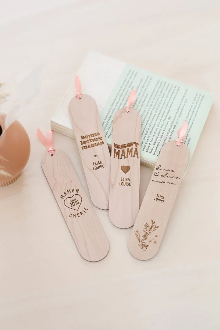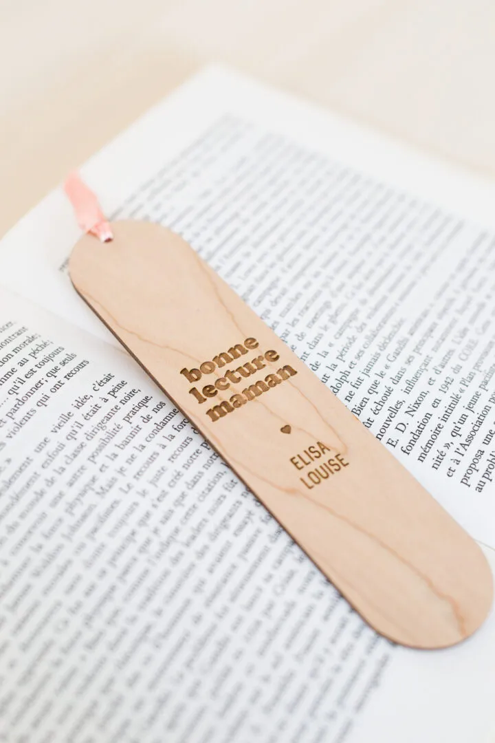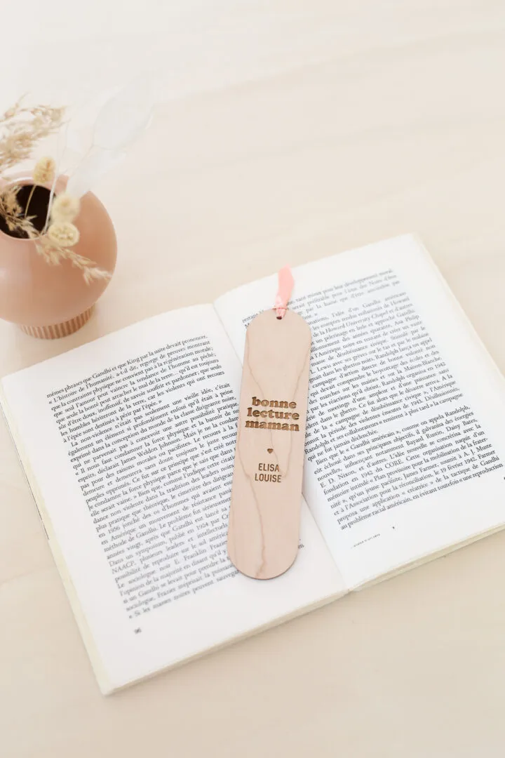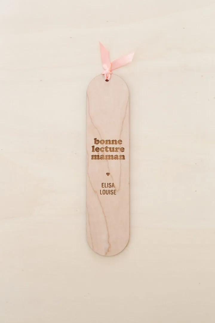 Un marque page en bois avec une gravure « BONNE LECTURE MAMAN » et son petit noeud de satin rose. « BONNE LECTURE MAMAN » personnalisé du prénom de(s) enfant(s) pour accompagner votre maman en pensée à chacune de ses lectures. Délais de fabrication : 2 jours Livraison : 72h en lettre suivie Matériaux : bois d’érable + ruban de satin Dimensions : 17×4 cm – épaisseur 3mm