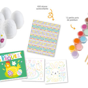 Dans ce coffret, les jeunes enfants (et les plus grands) vont trouver 6 œufs en plâtre, 12 pots de peinture, deux pinceaux en bois (un plat et un fin), un livre de coloriages et plus de 400 strass autocollants pour réaliser de superbes décorations de Pâques.