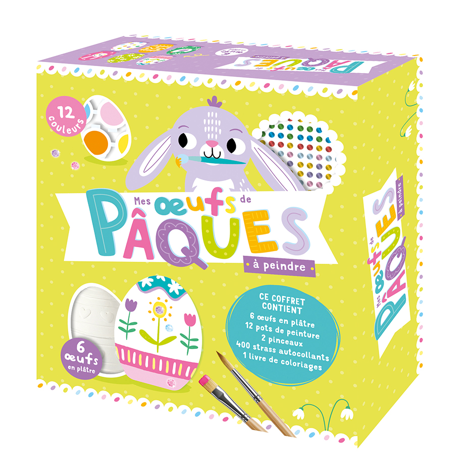 Dans ce coffret, 6 œufs en plâtre, 12 pots de peinture, deux pinceaux en bois, un livre de coloriages et plus de 400 strass autocollants