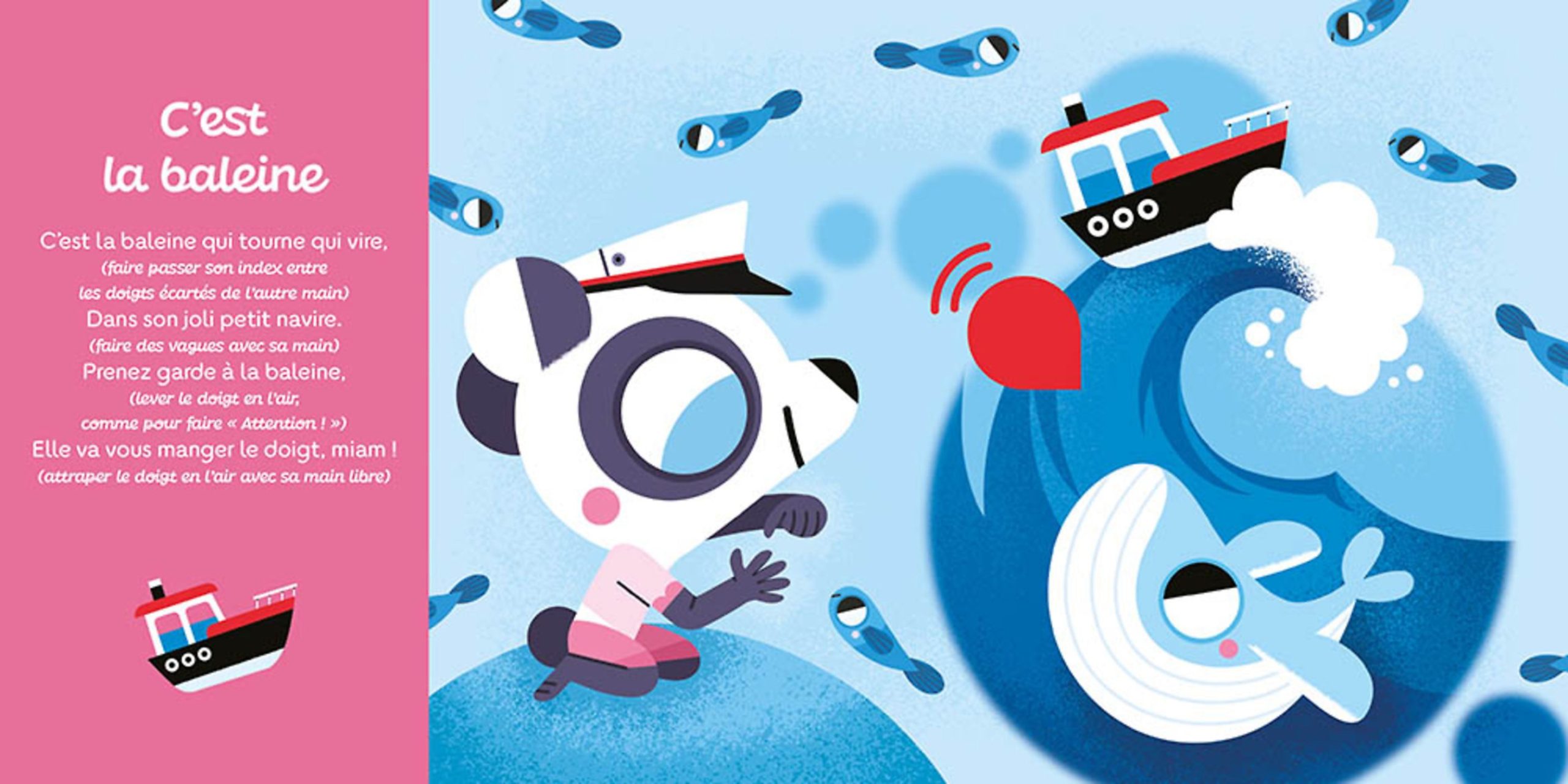 Ici, on retrouve : Ainsi font, font, font, Jean Petit qui danse, Savez-vous planter les choux ?, J’ai un gros nez rouge, Un petit pouce qui danse et C’est la baleine.