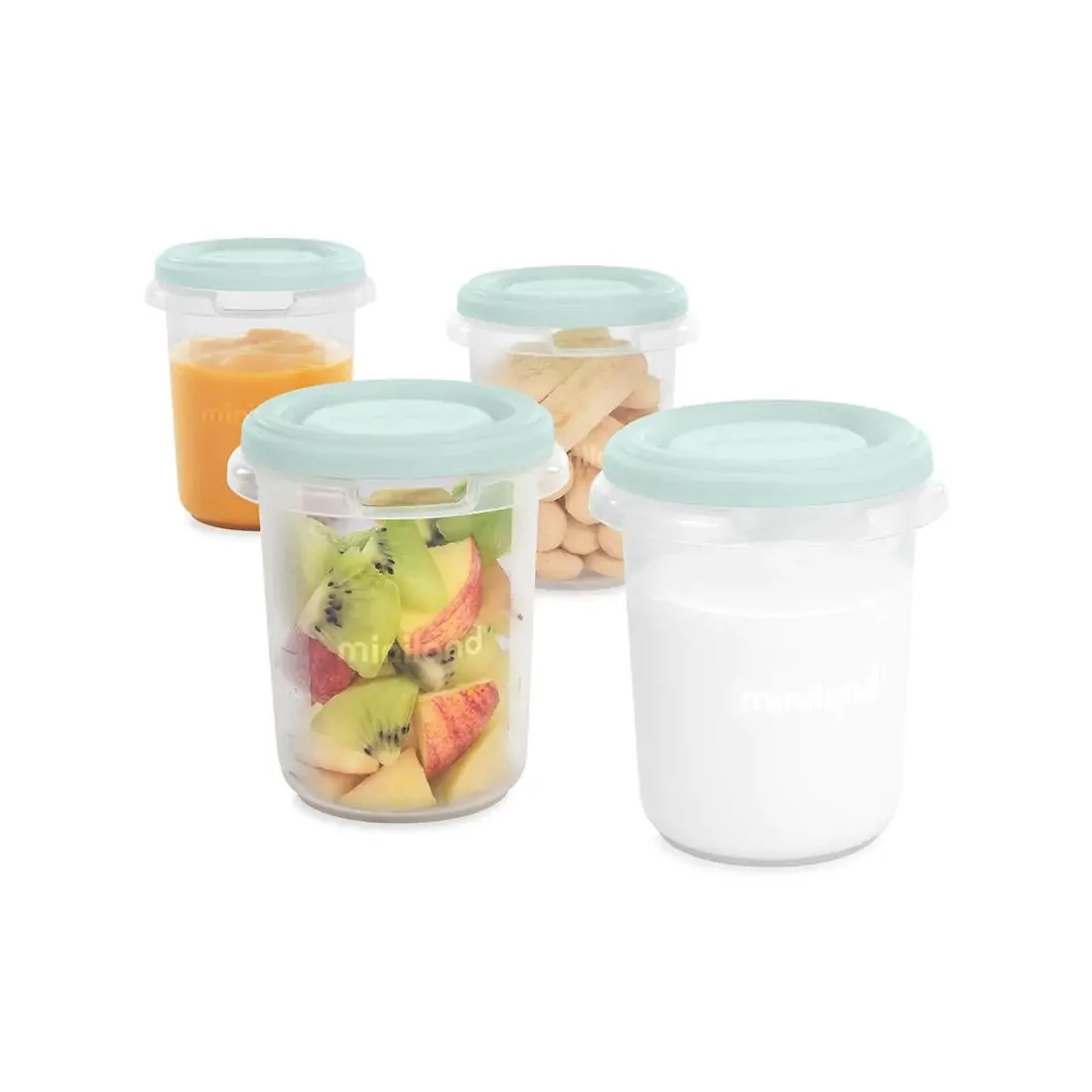 Miniland Set 4 pots de conservation Mint. Quatre récipients hermétiques d’une capacité de 250 ml et gradués sur le côté, pour congeler et décongeler les repas de votre bébé chaque fois que nécessaire. Recommandés spécialement pour le lait maternel. Avec leur couvercle de couleur menthe, vous pourrez toujours les repérer et les différencier des autres. Grâce à leur qualité exceptionnelle, vous pouvez décongeler dans le même récipient à l’aide d’un chauffe-biberon, d’un micro-ondes ou d’un bain-marie. Comme votre bébé le préfère ! Fabriqué en Espagne.
