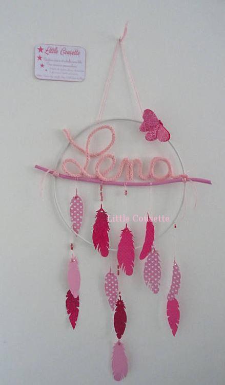 Vous pouvez personnaliser ce mobile attrape-rêves avec le prénom de bébé en tricotin (ici: Léna) ou tout autre mot de votre choix (love, jolis rêves..).