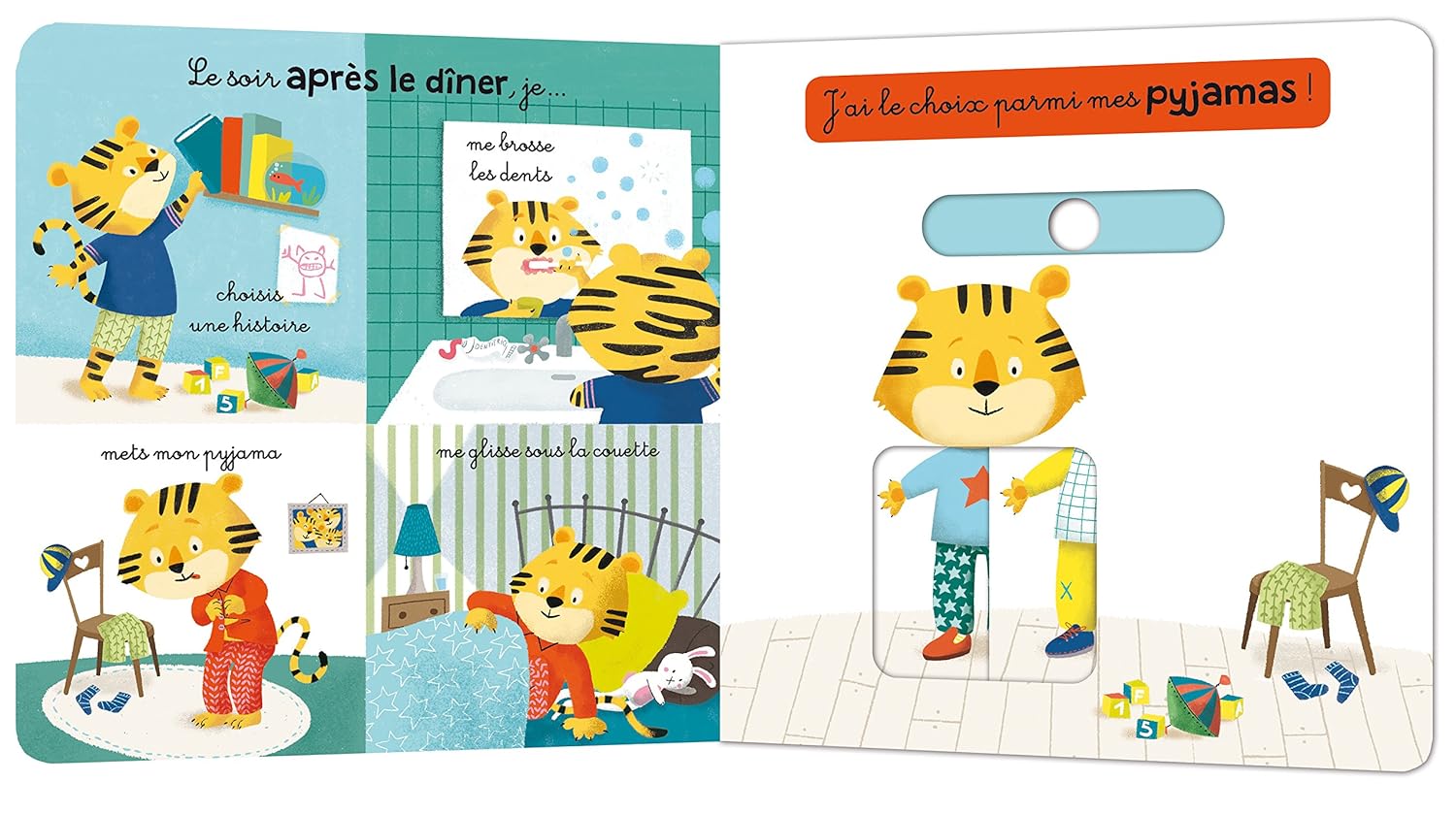 On retrouve toujours 5 mécanismes solides, logiques et adaptés aux petites mains, faciles à manipuler, et une double finale qui récapitule les apprentissages de façon ludique, grâce à un jeu de flaps.