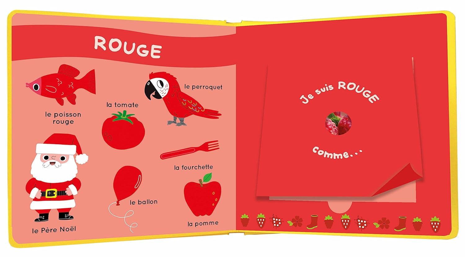 Chaque page de gauche présente une couleur grâce à de jolies illustrations ; chaque page de droite propose un rabat à soulever : en frottant son doigt sur l’image au-dessous, l’enfant y découvrira une odeur mystère !