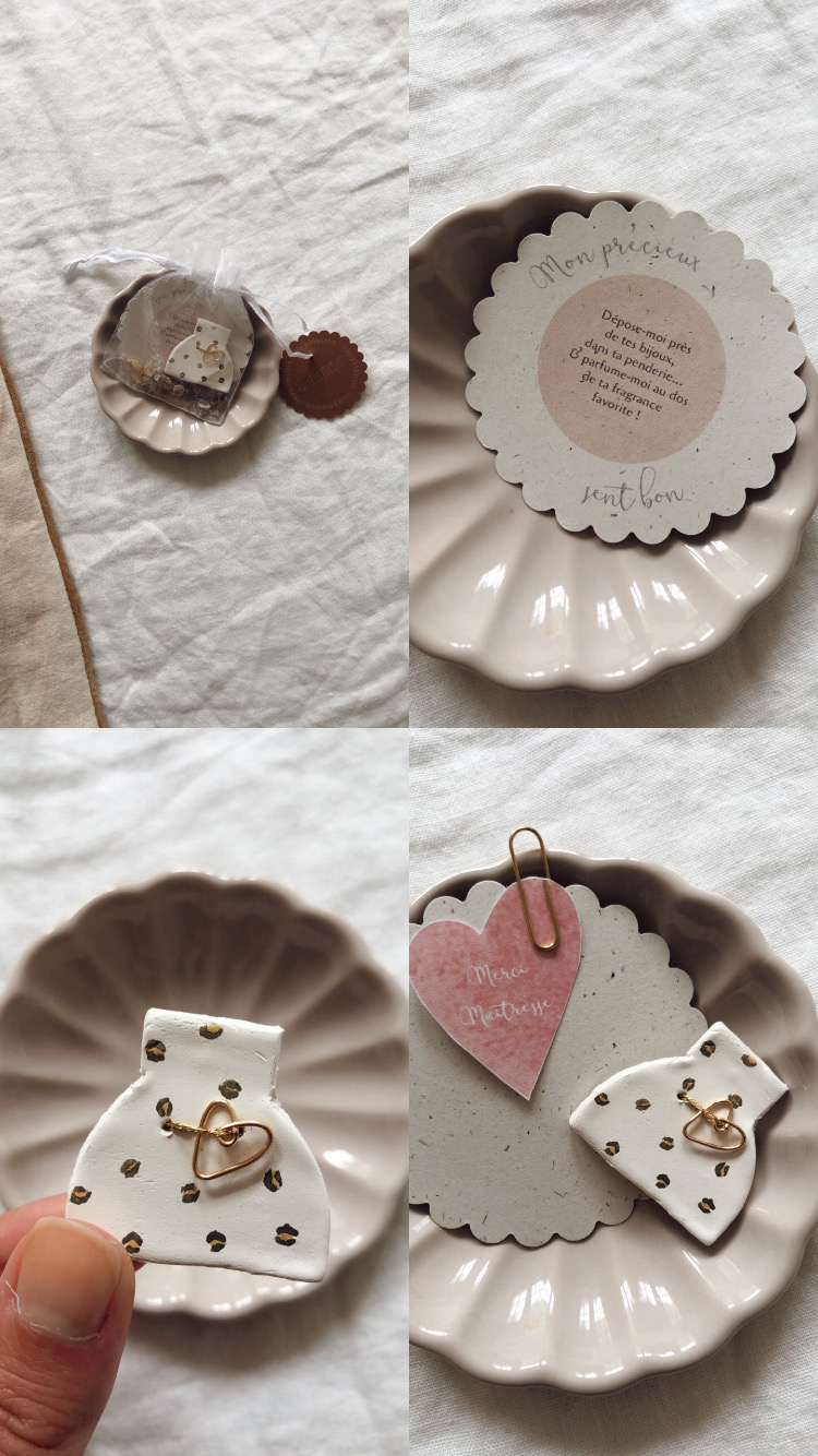 Mon précieux sent bon. Doux mélange d’un petit vase en argile, cœur filaire très fin & de dessin à l’aquarelle. Le petit cœur est minutieusement cousu au vase en argile au fil d’or. A déposer près de tes bijoux ou dans ta penderie. Parfume au dos de ta fragrance favorite. Si tu l’offres, pense à mettre un petit mot personnalisé au dos de la petite carte <3
