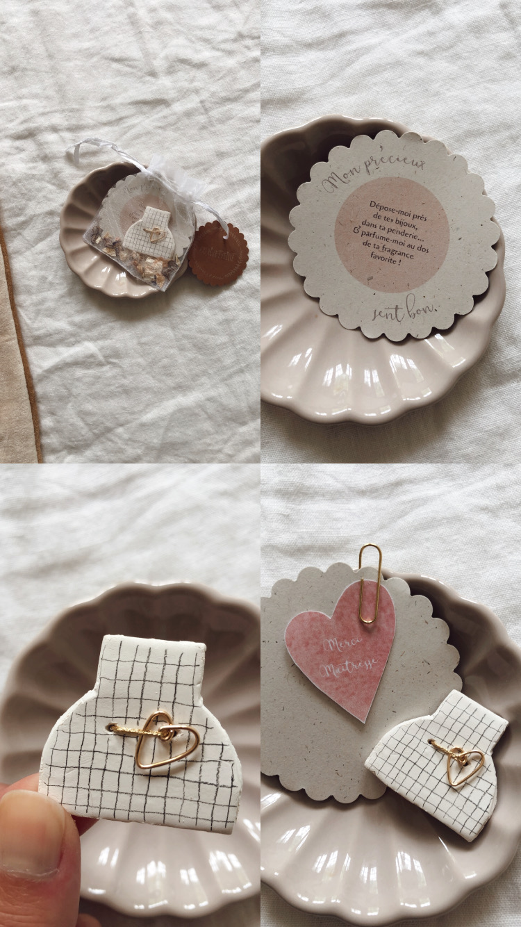 Mon précieux sent bon. Doux mélange d’un petit vase en argile, cœur filaire très fin & de dessin à l’aquarelle. Le petit cœur est minutieusement cousu au vase en argile au fil d’or. A déposer près de tes bijoux ou dans ta penderie. Parfume au dos de ta fragrance favorite. Si tu l’offres, pense à mettre un petit mot personnalisé au dos de la petite carte <3