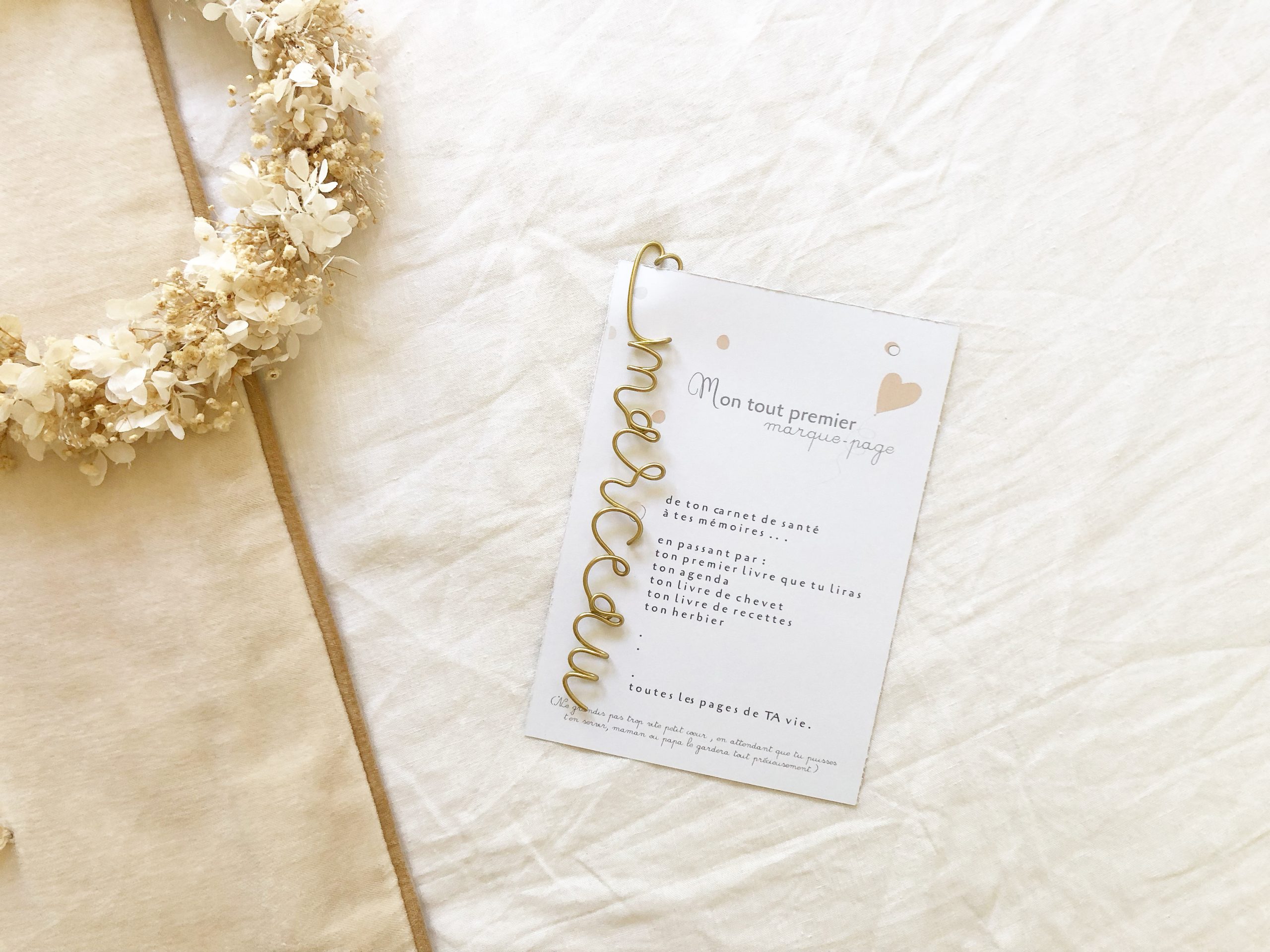 Mon tout premier marque-page. Une jolie idée de cadeau naissance. Préciser en fin de commande, dans l’onglet « commentaire, notes » LE MOT ET LA COULEUR (doré ou noir). Et le prénom souhaité bien entendu 😉