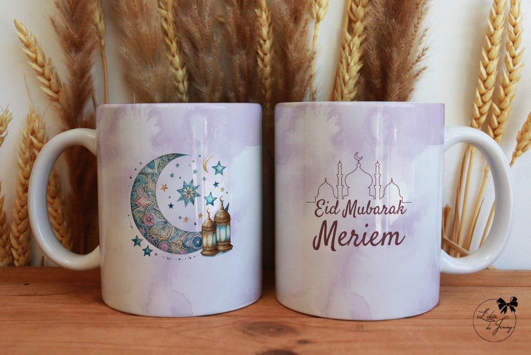 Ce joli mug est parfait pour déguster un café, un thé ou un chocolat chaud tout en pensant à cette fête spéciale. Personnalisé avec un prénom et une élégante calligraphie “Eid Mubarak”, il deviendra rapidement une tasse favorite 💖.
