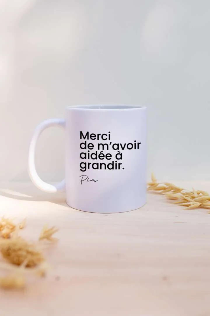Mug en céramique blanc avec une anse très large pour une prise en main très agréable. Cette collection tombe à pic pour offrir un petit présent aux enseignant.e.s de votre enfant en cette fin d’année scolaire. Un design sobre et minimaliste avec cette petite phrase symbolique « merci de m’avoir aidé à grandir » pour remercier maîtresse, maître, atsem mais aussi nounou avec la personnalisation du prénom de votre enfant. Cela marche également avec deux prénoms pour les jumeaux ! Dimension : Ø 75 mm Contenance env. 300 ml Matière : céramique Délai de fabrication : 2 à 3 jours ouvrés Livraison…