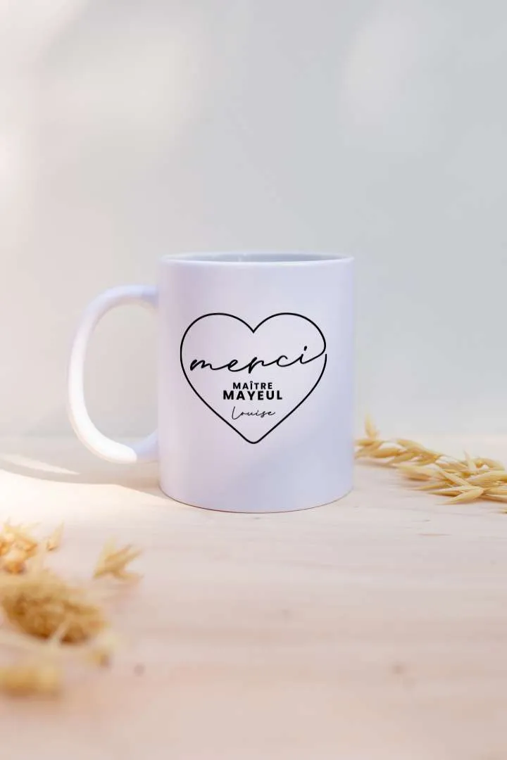 Un joli mug en céramique pour remercier maîtresse, maître, atsem mais aussi nounou avec la personnalisation du prénom de votre enfant. Cela marche également avec deux prénoms pour les jumeaux !