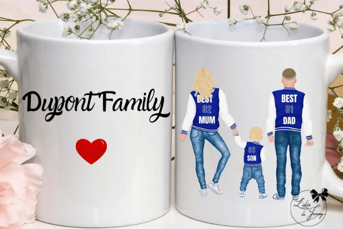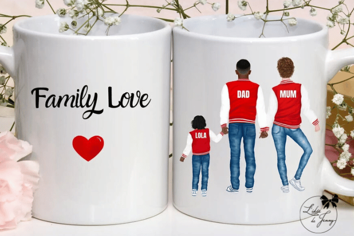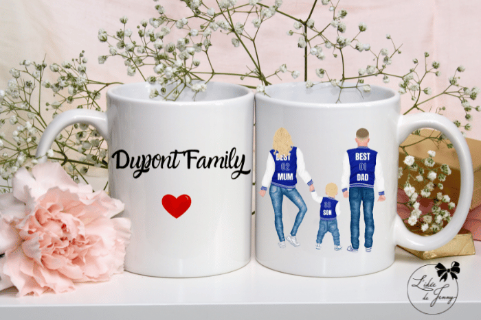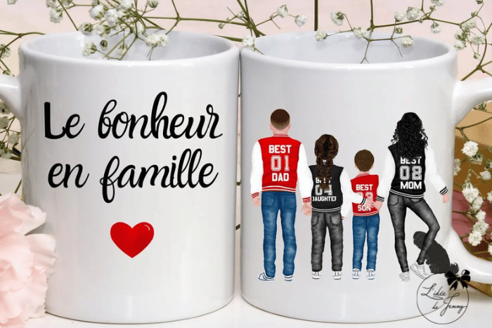 Le mug est imprimé des deux côtés, un avec le texte l’autre avec la famille.