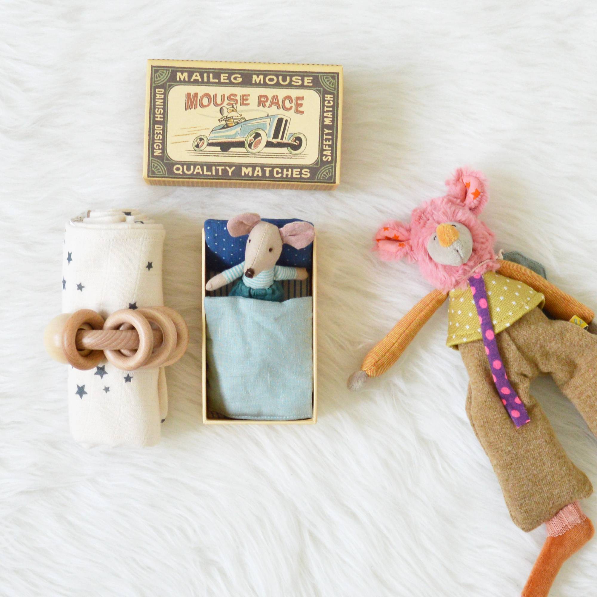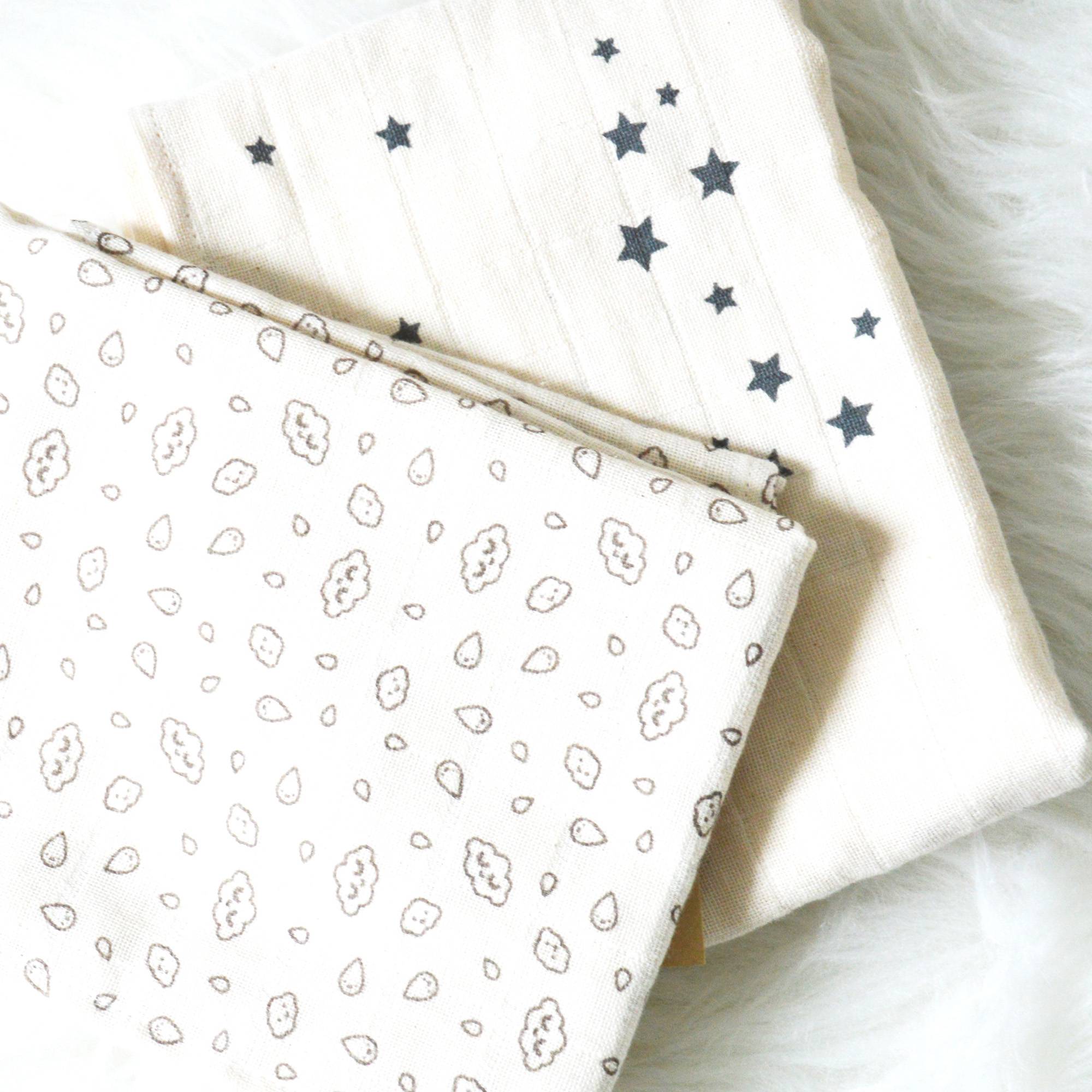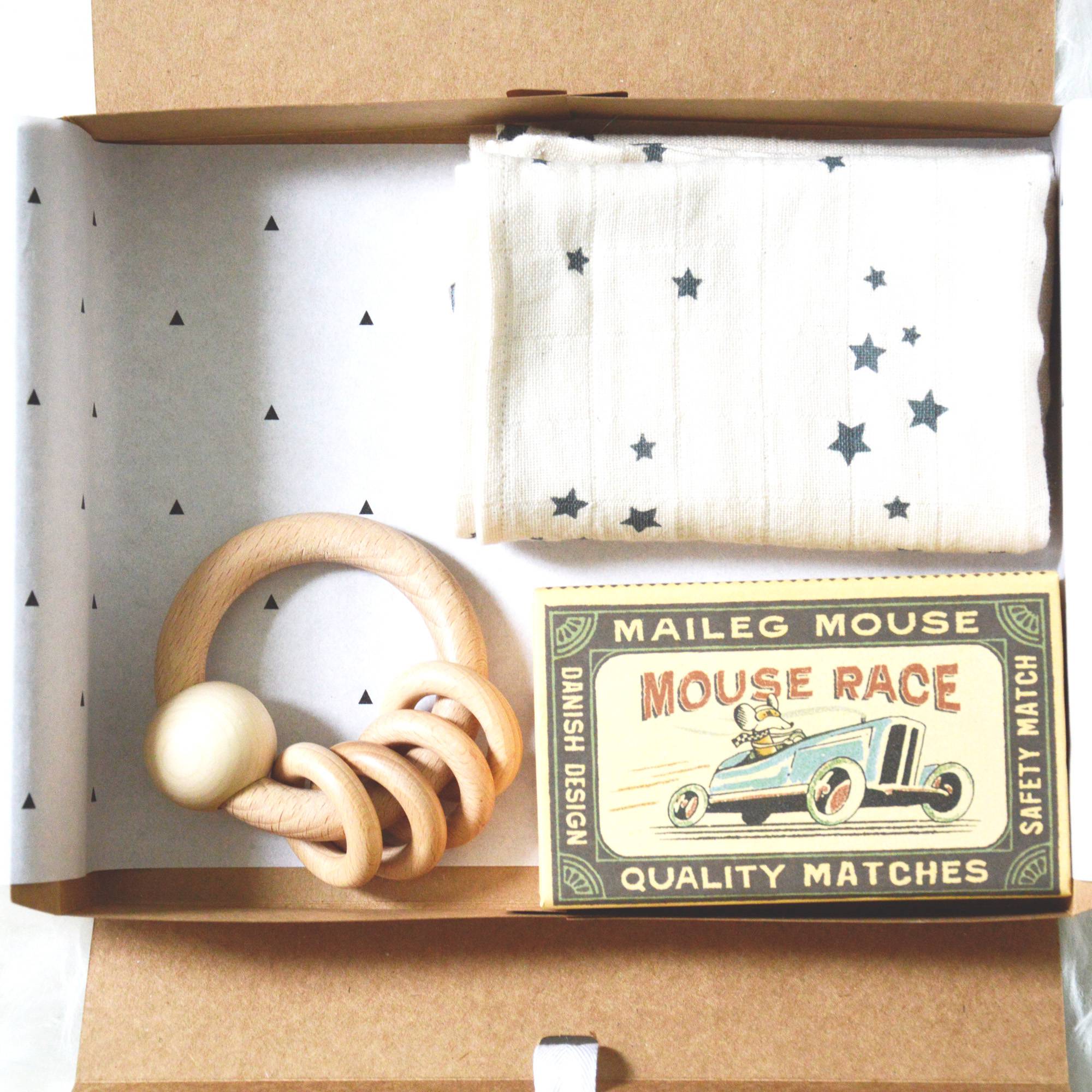 * lange étoiles en coton biologique + anneau de dentition en bois naturel et cire d’abeille. (60 cm x 60 cm) pour bébé