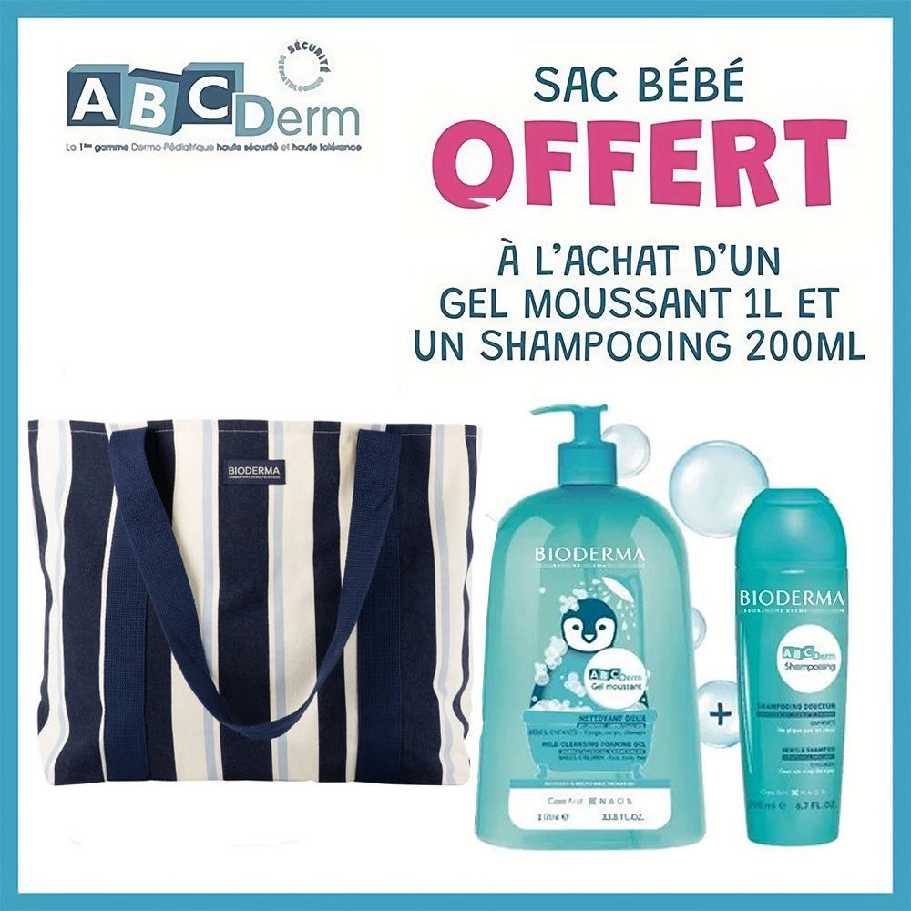 Offre : Bioderma ABCDerm Gel Moussant Nettoyant Doux 1L + Shampooing 200ml = Sac Offert