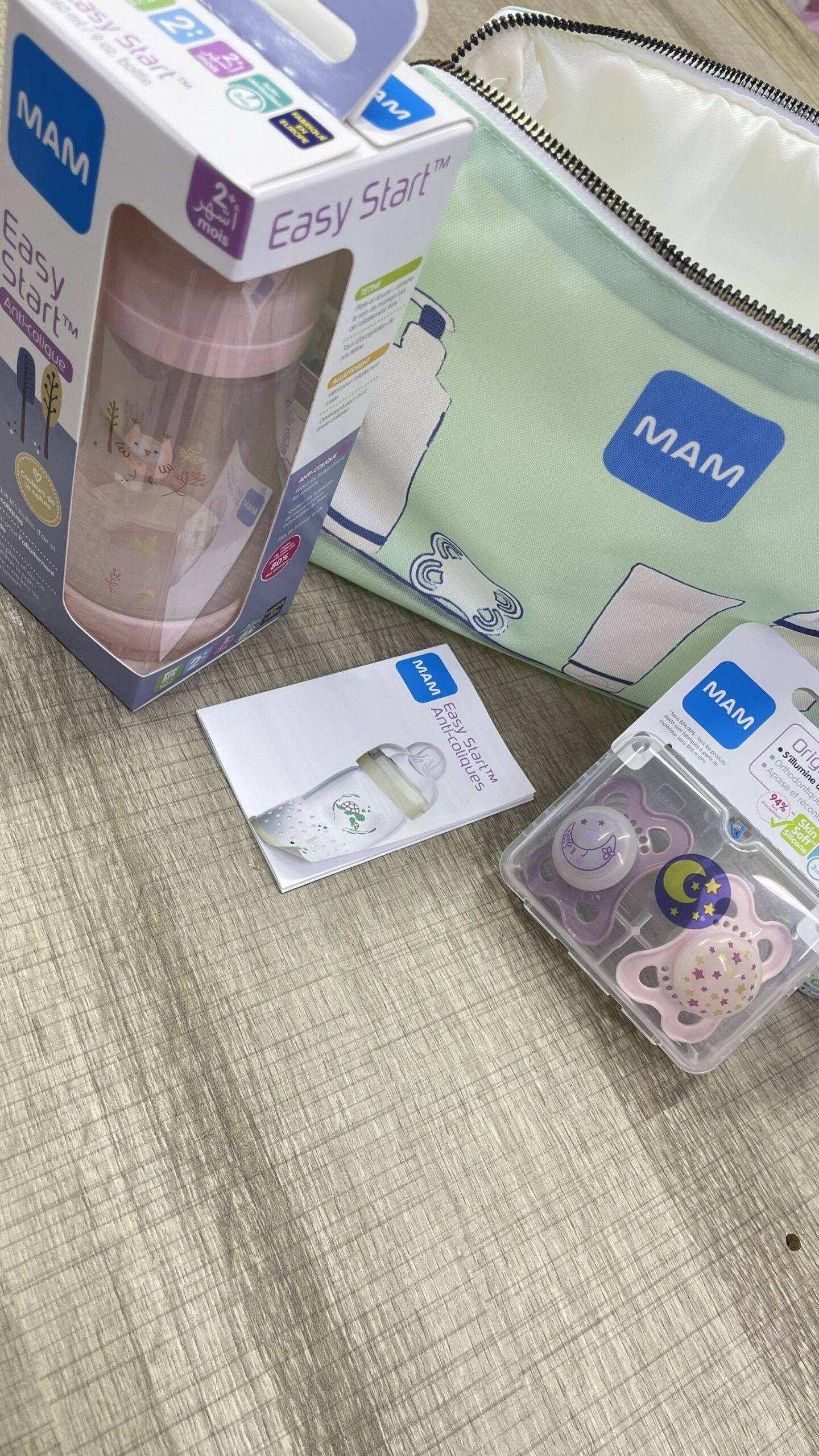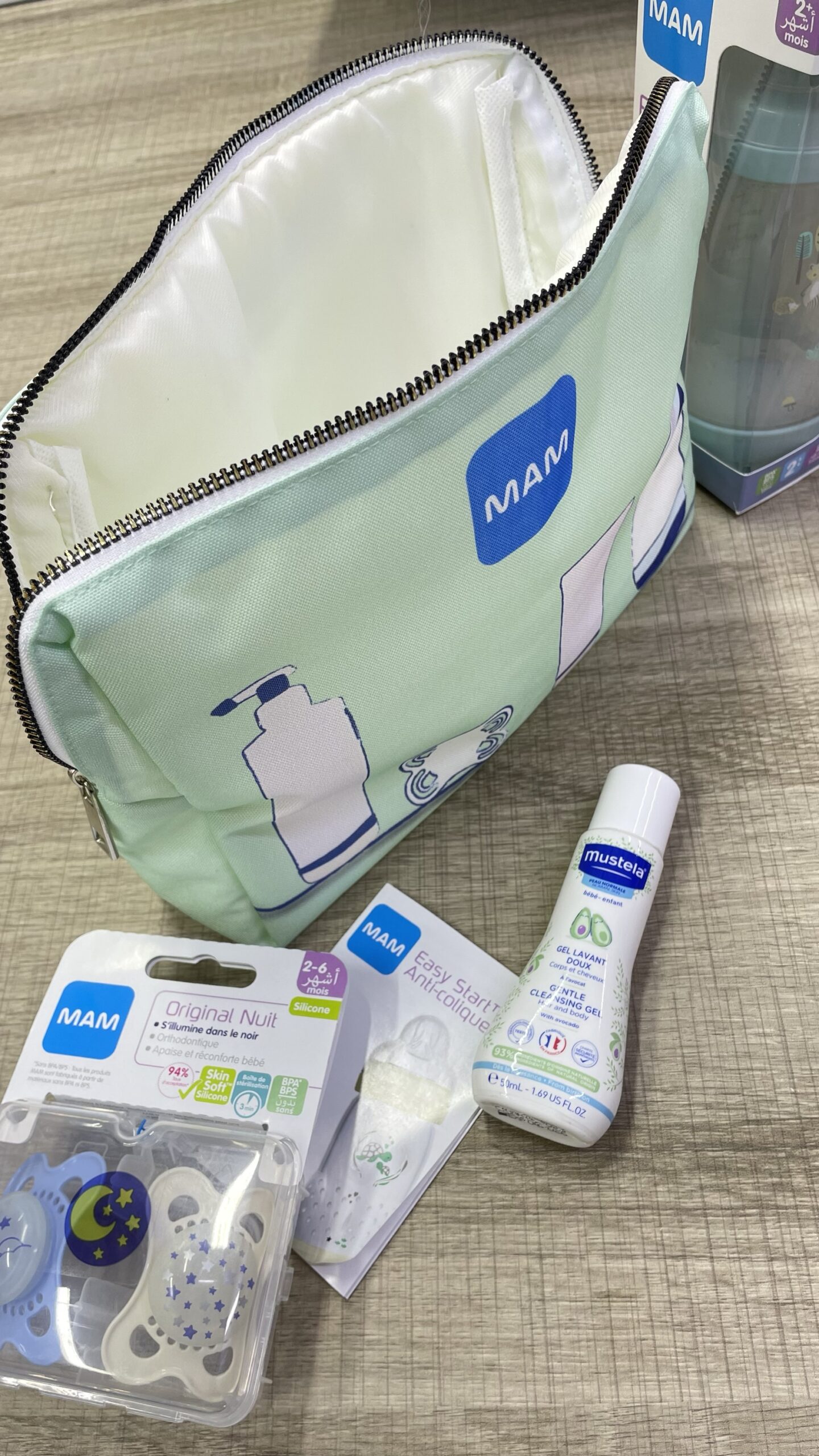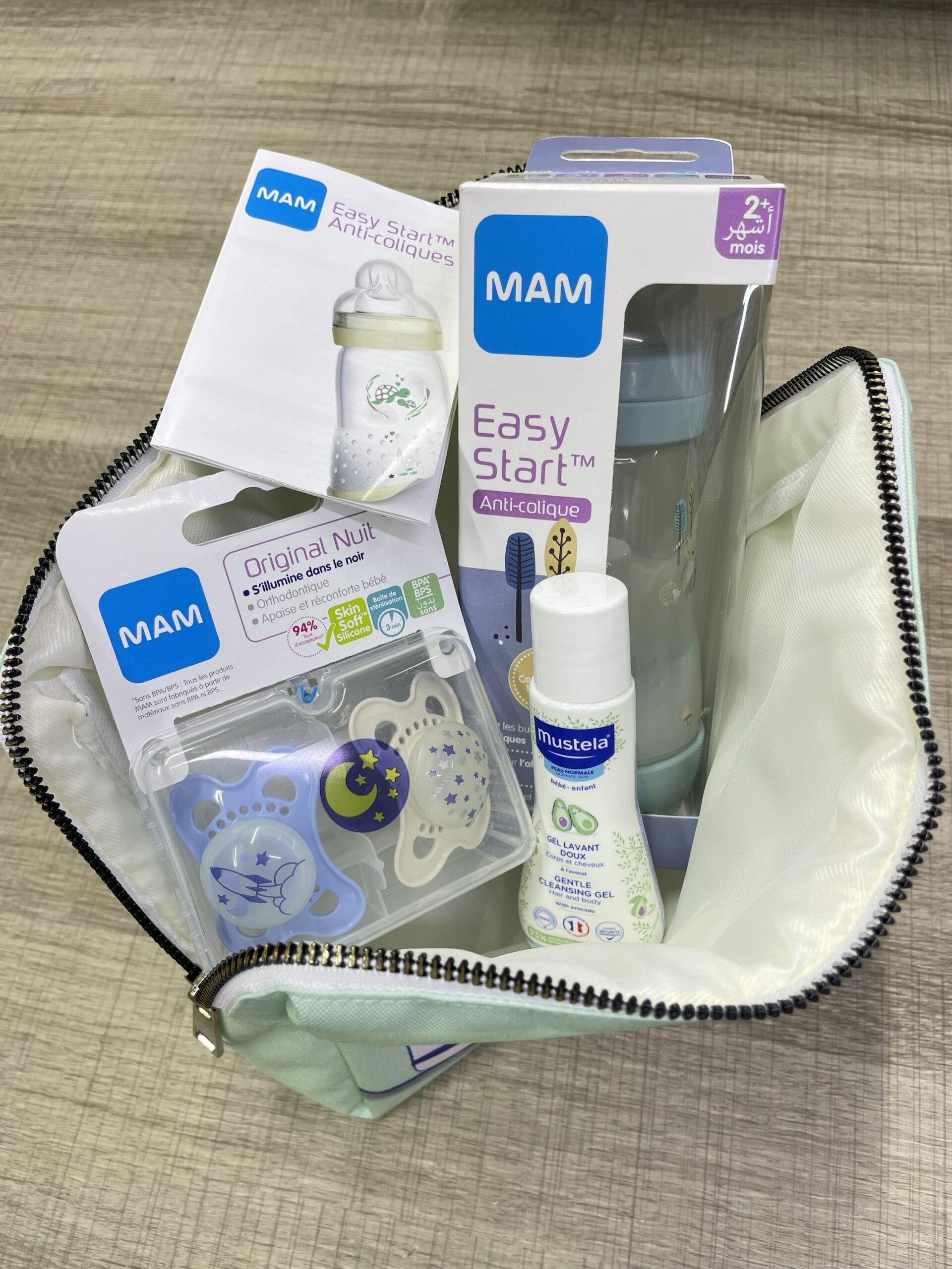 BIBERON PLASTIQUE 260 ML ANTI COLIQUE 2 MOIS + 2 SUCETTE MAM ORIGINAL NUIT 2-6 MOIS MINIATURE MUSTELA GEL LAVANT 50 ML