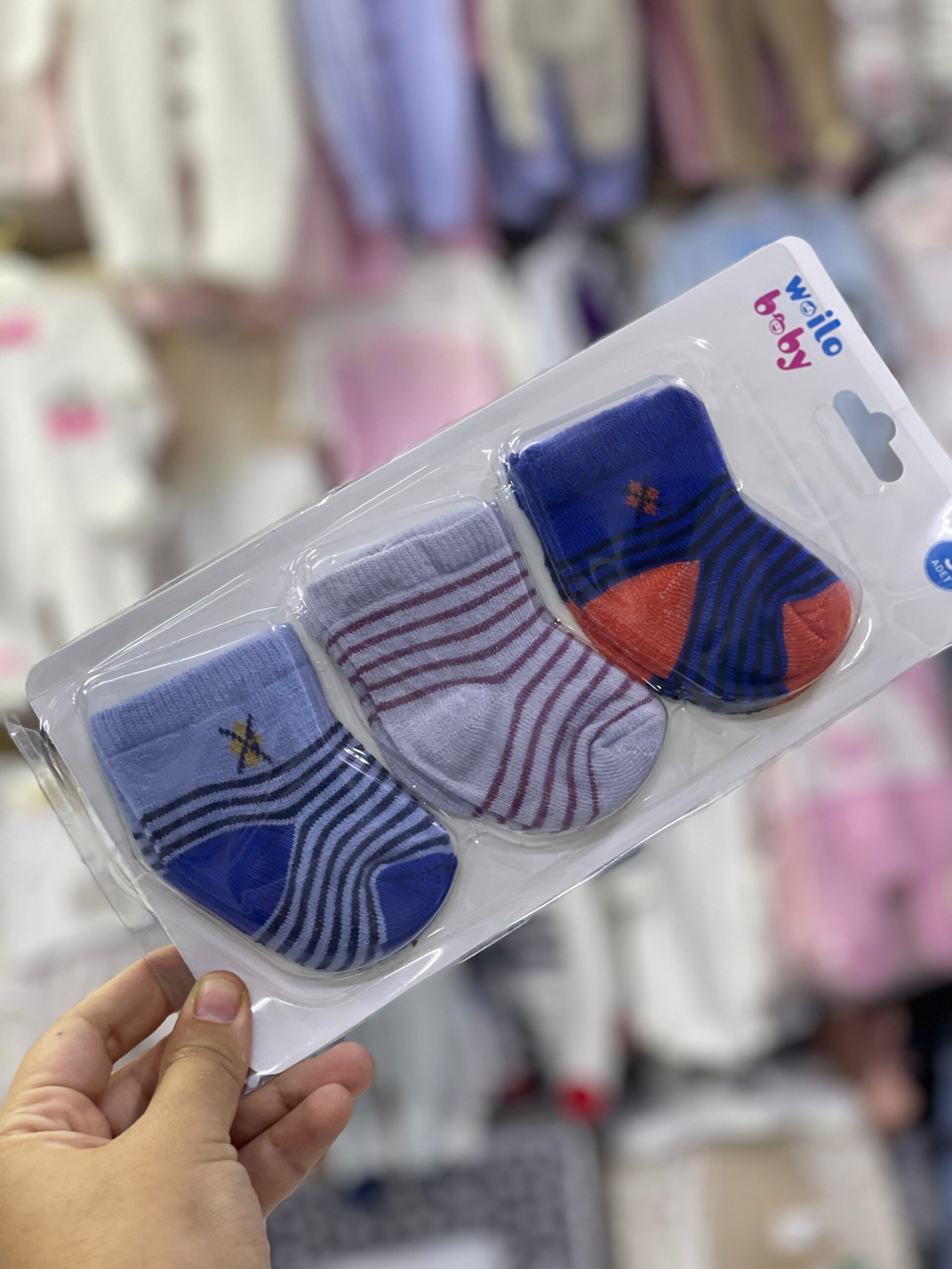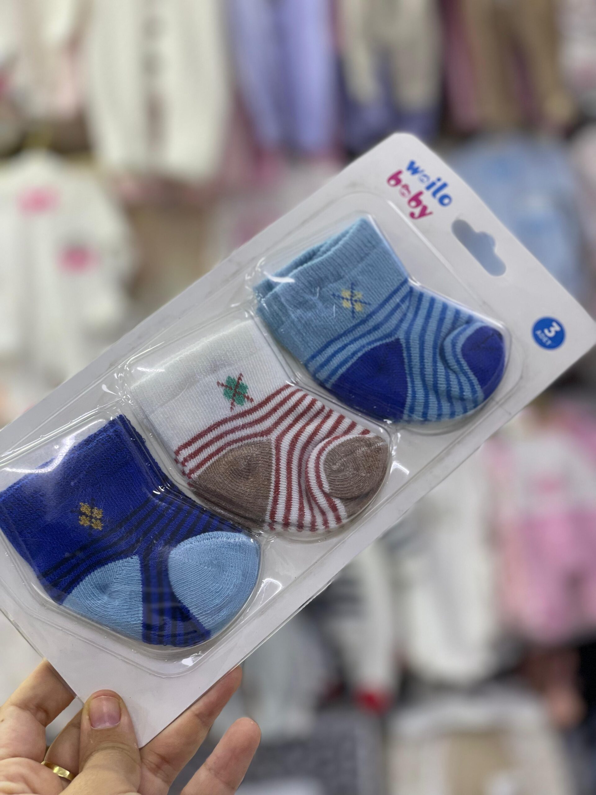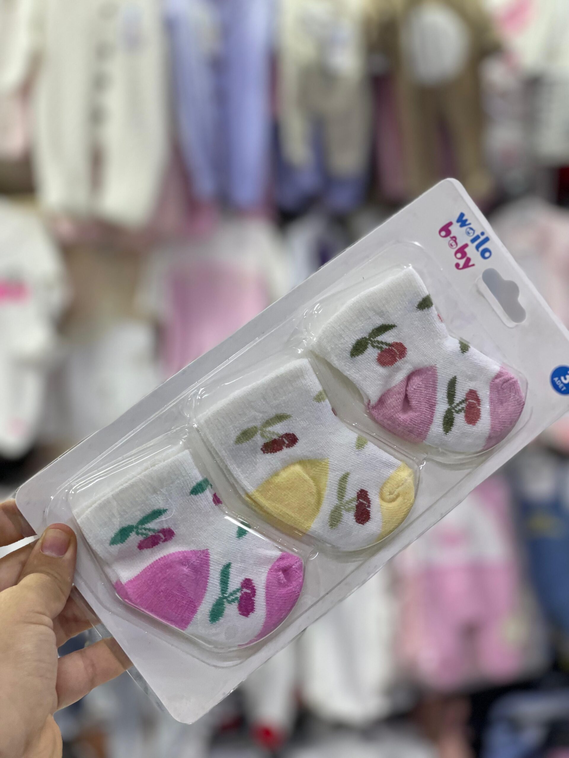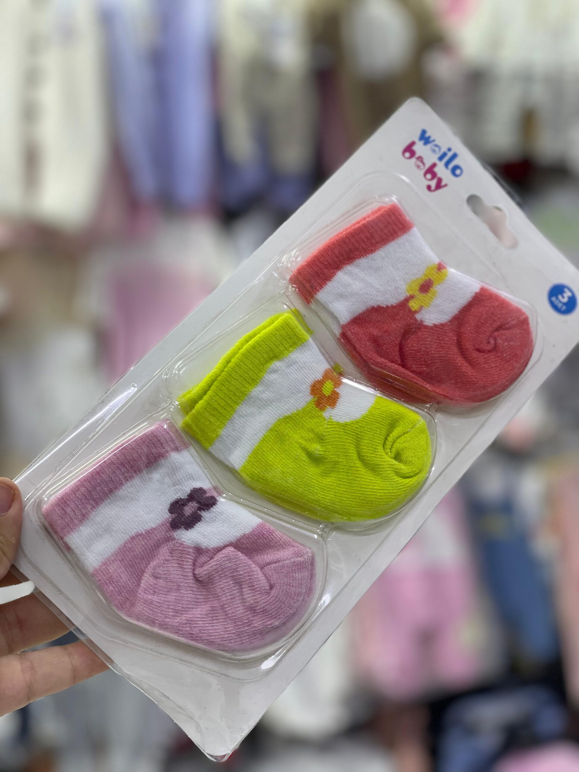 Lot de 3 paires de chaussettes bébé fille mesurant les premiers jours de naissance en coton doux. Le paquet se compose de 3 paires de chaussettes à motifs dans les tons.