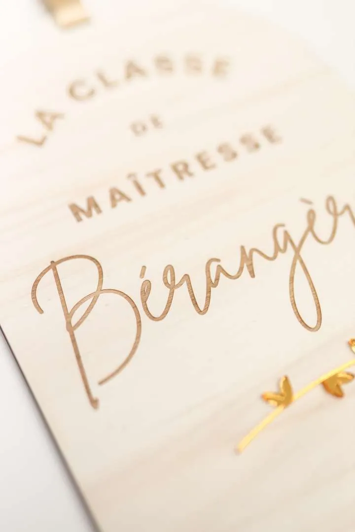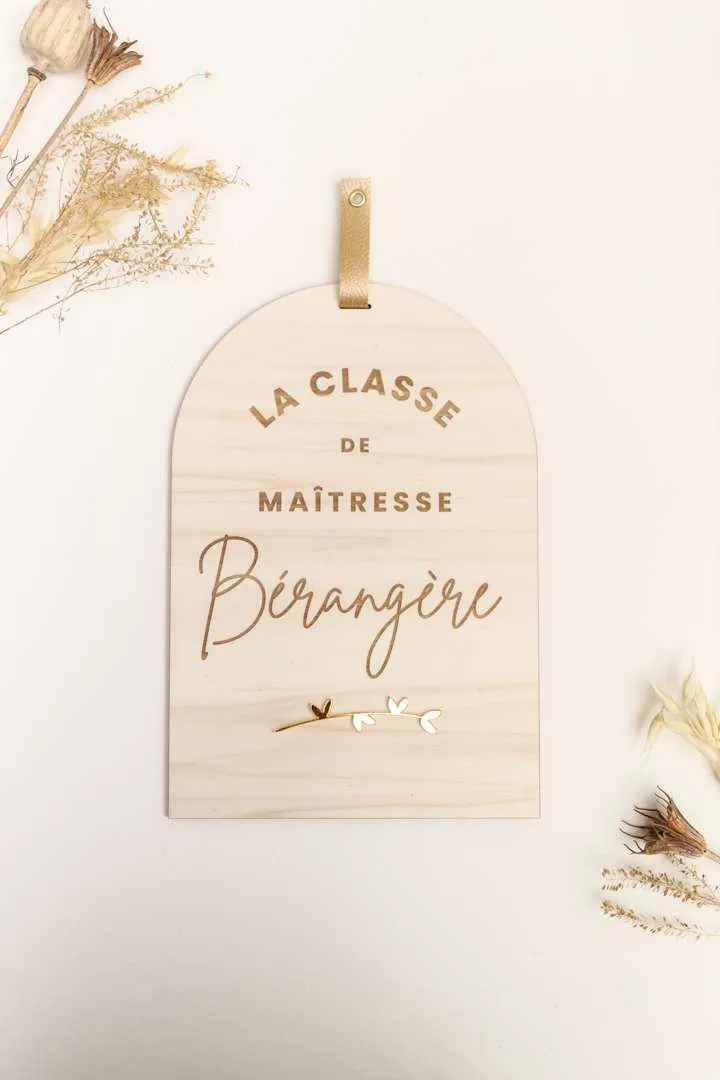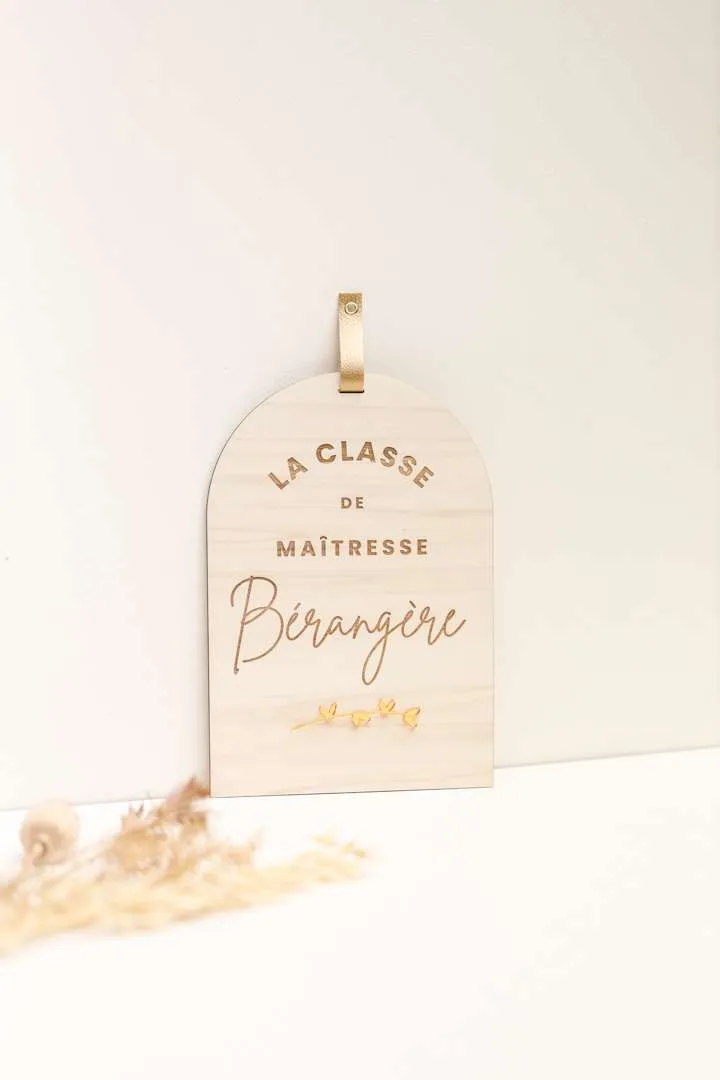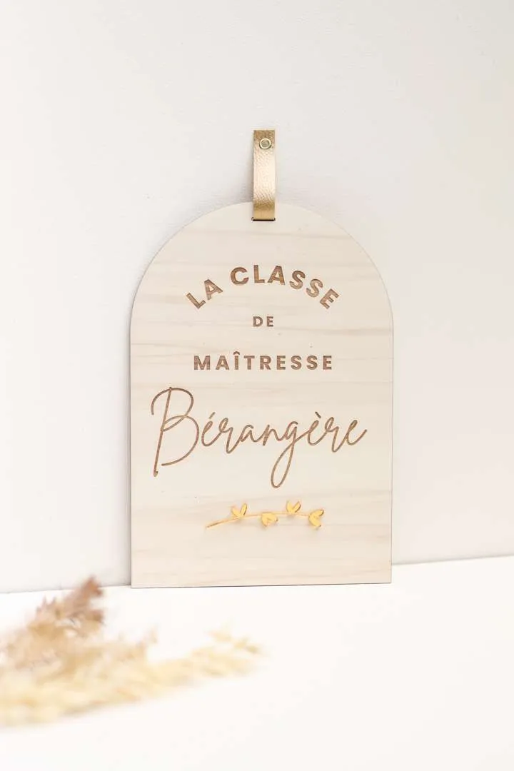 Une pancarte en bois afin que la maîtresse de votre enfant annonce joliment où se trouve sa classe dans l’école ! Un cadeau original à offrir en fin d’année scolaire ! Existe aussi en version maître. Dim : 20X28,5cm Matière : bois de peuplier – 5mm d’épaisseur – Attache en simili-cuir doré Délai de fabrication : 4 jours ouvrés Délai de livraison : 48h en Colissimo