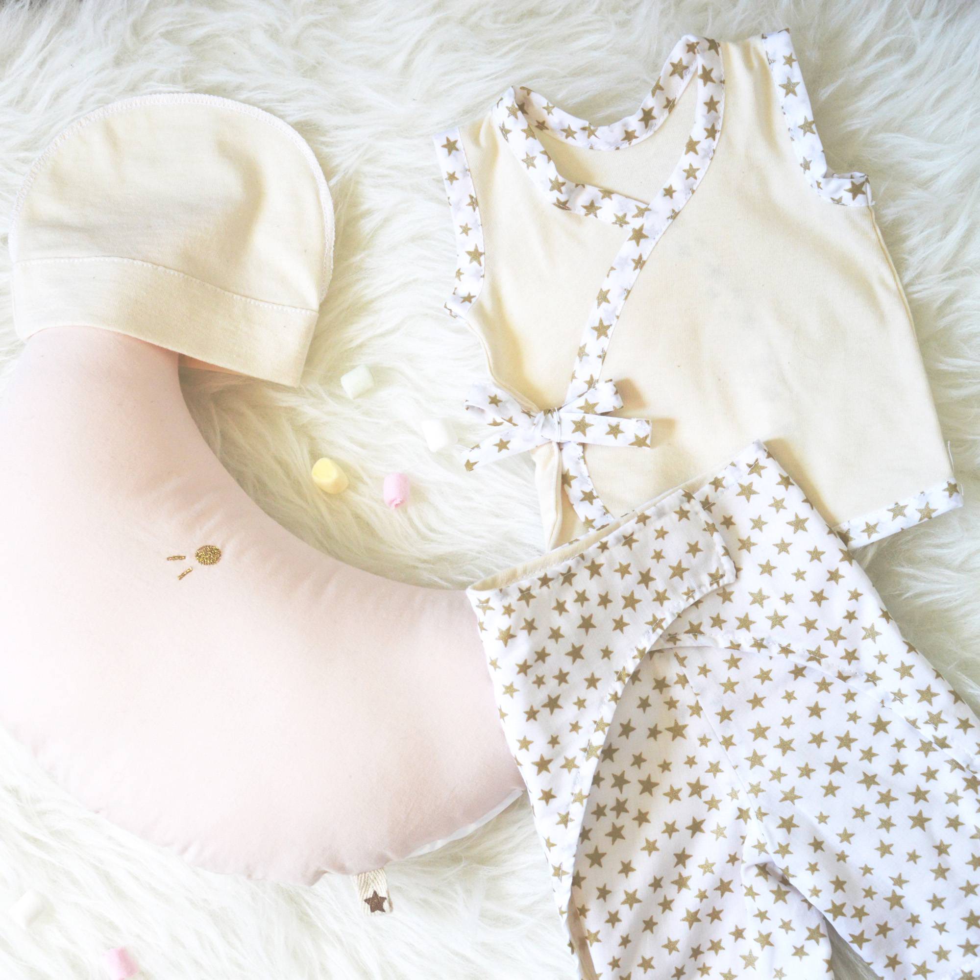 - 1 ensemble chemisette et pantalon en coton bio pour 1,5 kg (blanc à étoiles dorées)