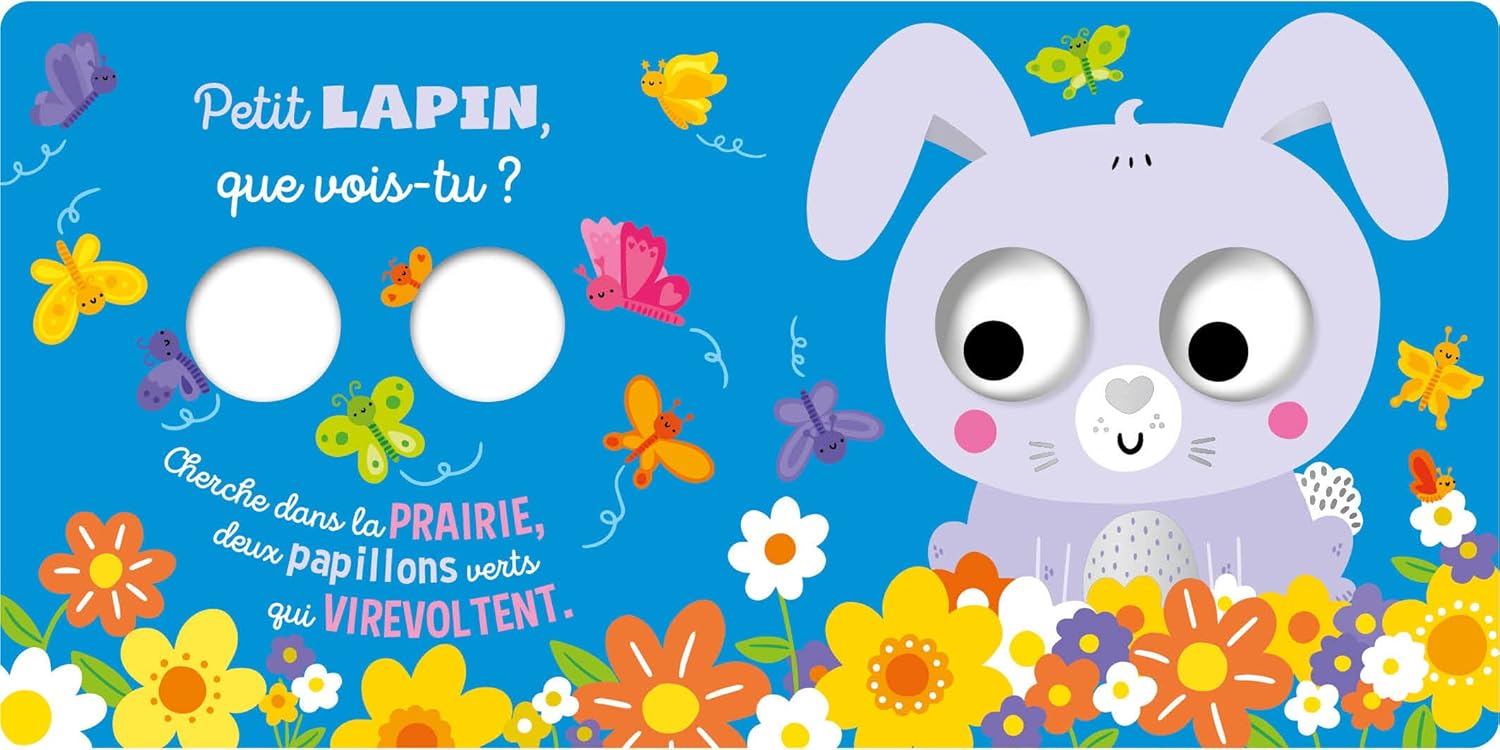 Cinq animaux très mignons, des gros yeux qui bougent sur toutes les pages, des surfaces à toucher, du papier doré et des choses à chercher : les touts petits vont être captivés par ce livre très coloré !