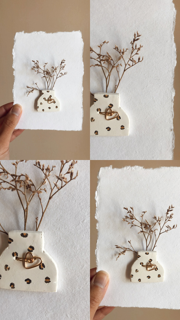 Doux mélange d’un petit vase en argile, cœur filaire très fin & de dessin à l’aquarelle.