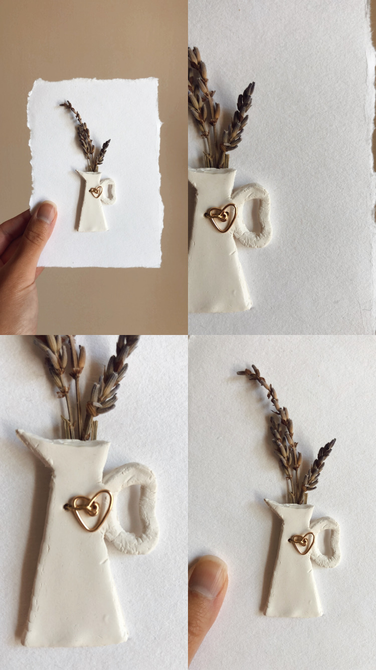 Doux mélange d’un petit vase en argile, cœur filaire très fin & de dessin à l’aquarelle.