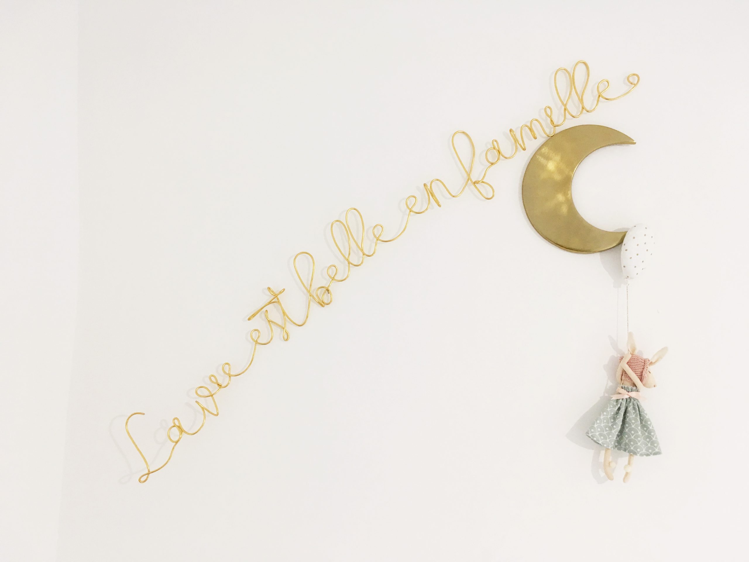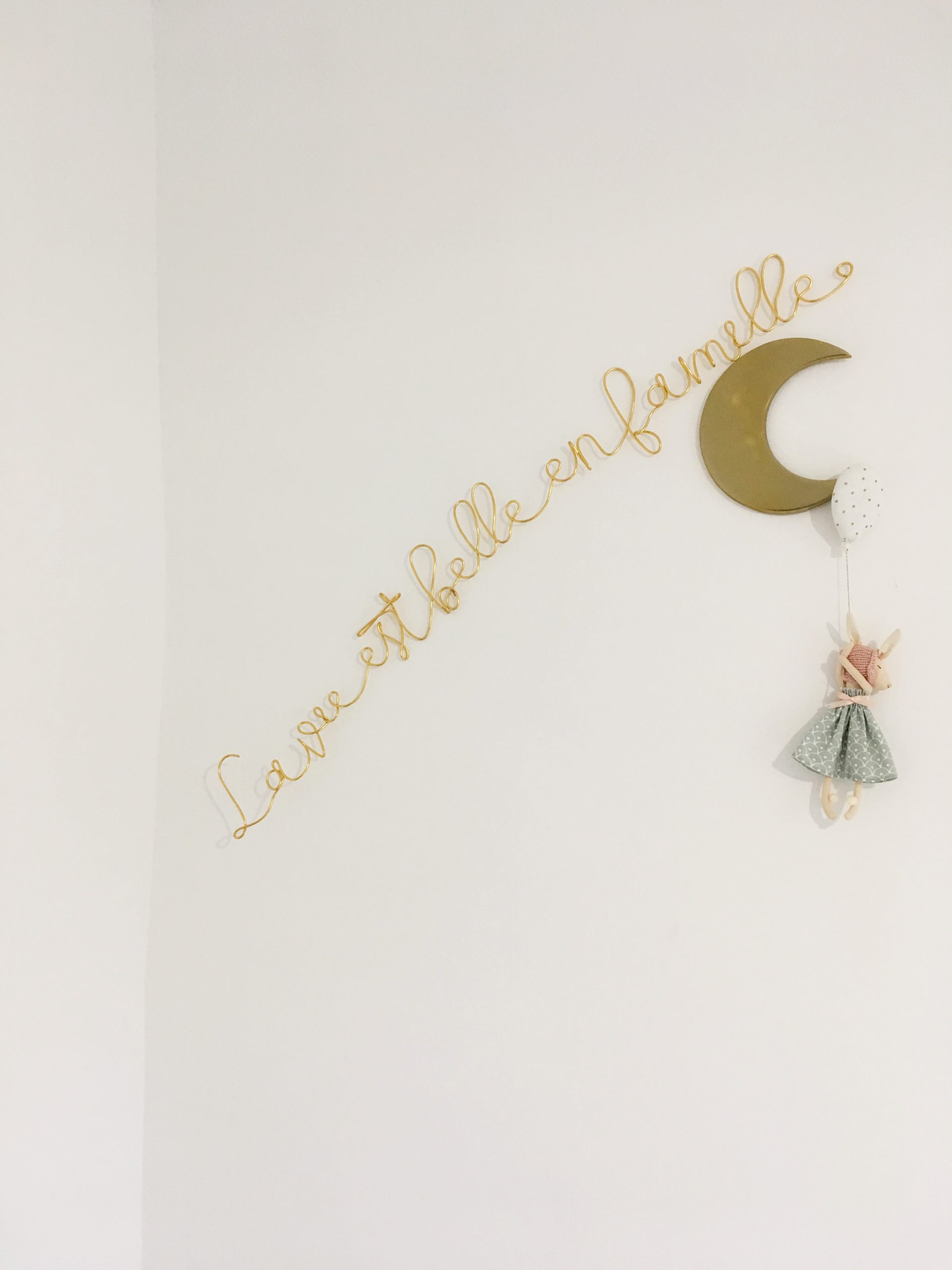 Phrase en filaire dorĂ© pour une jolie dĂ©coration de votre home sweet home. Ici l’exemple de « La vie est belle en famille. » Possible Ă©galement sous ce format pour « La maison du bonheur », « La vie en rose », etc… La finesse et la dĂ©licatesse de cette phrase en filaire dorĂ© en font un Ă©lĂ©ment de dĂ©coration de votre intĂ©rieur hors du commun ! Hygge Ă souhait, dans la tendance du moment. Dimension d’environ 1m de long. Travail avec fil aluminium dorĂ© de 3mm pour un meilleur rendu de loin. ImaginĂ© avec tout mon cÅ“ur, fait main, fabriquĂ© en France. Photo d’exemple, non…