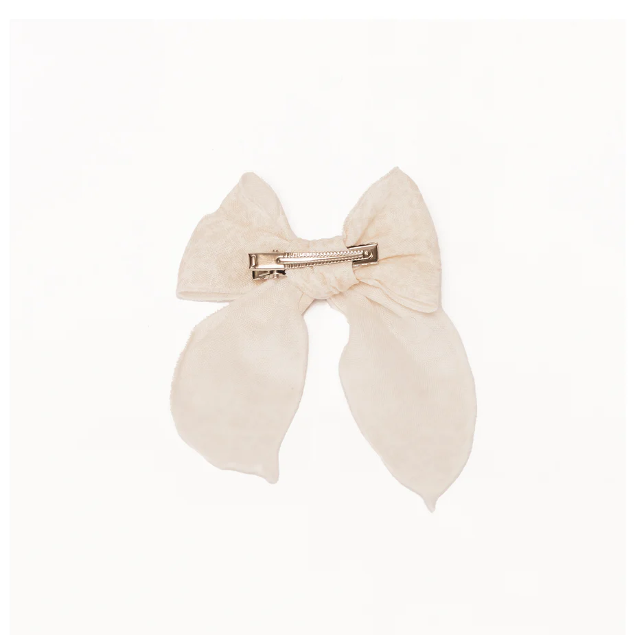 Nos pinces à cheveux nœuds sont fabriquées à la main au Portugal avec des tissus brodés 100% coton biologique.