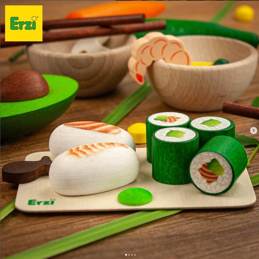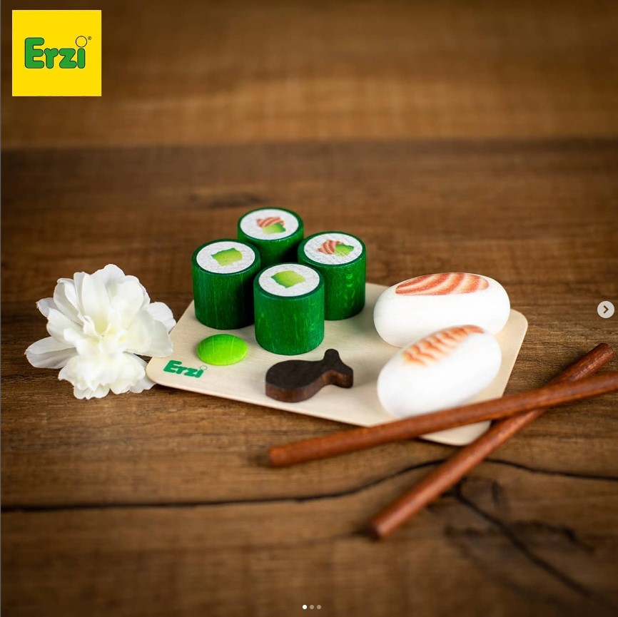 Ce set de sushis en bois de la marque allemande Erzi s’intègre très bien dans un magasin, une kitchenette ou un étal de marché.