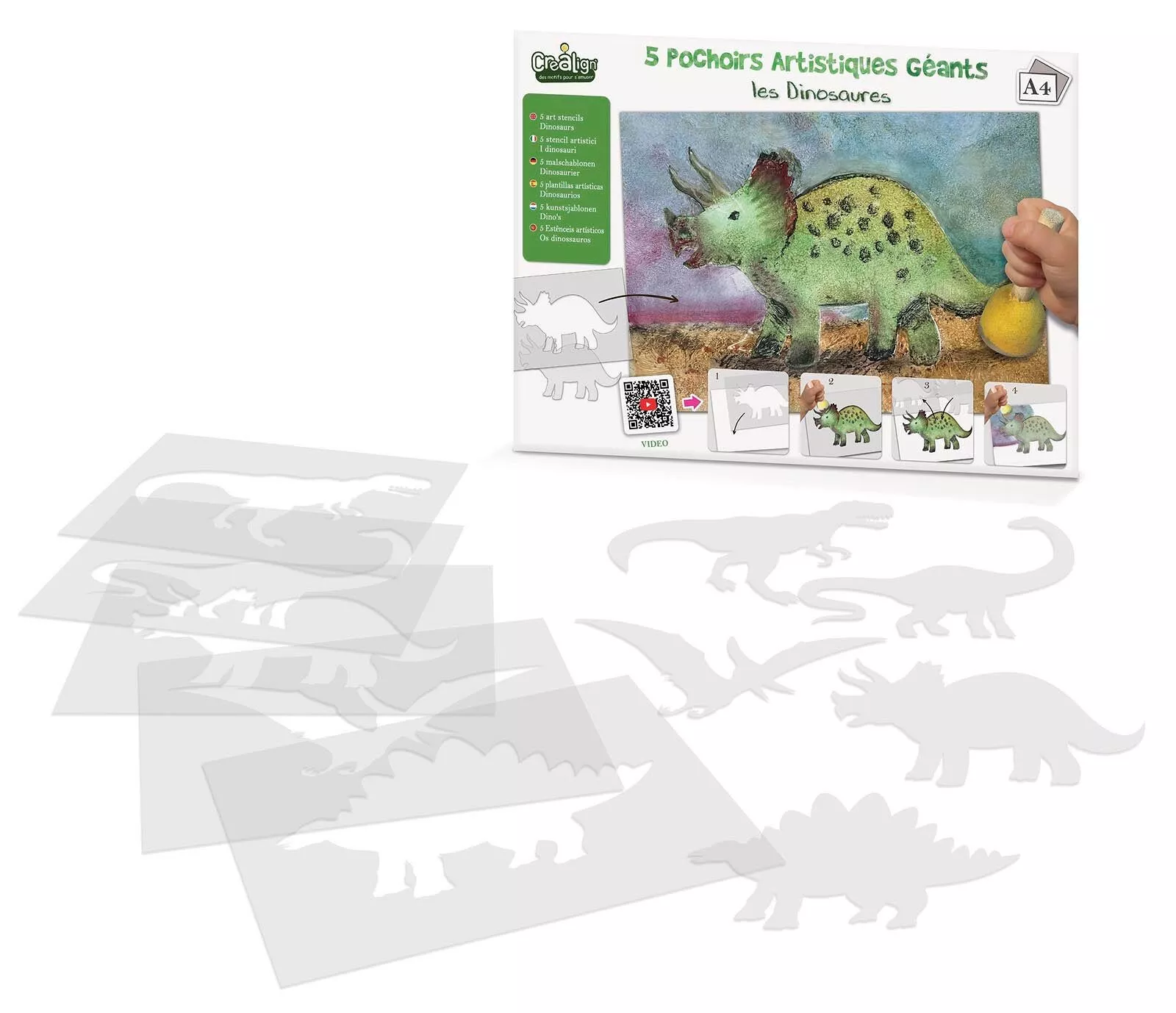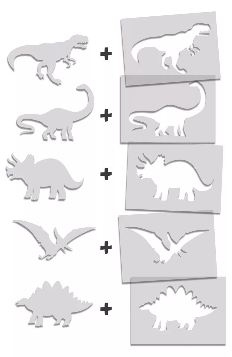 Une pochette contenant 10 pochoirs pour réaliser 5 dessins de dinosaures différents.