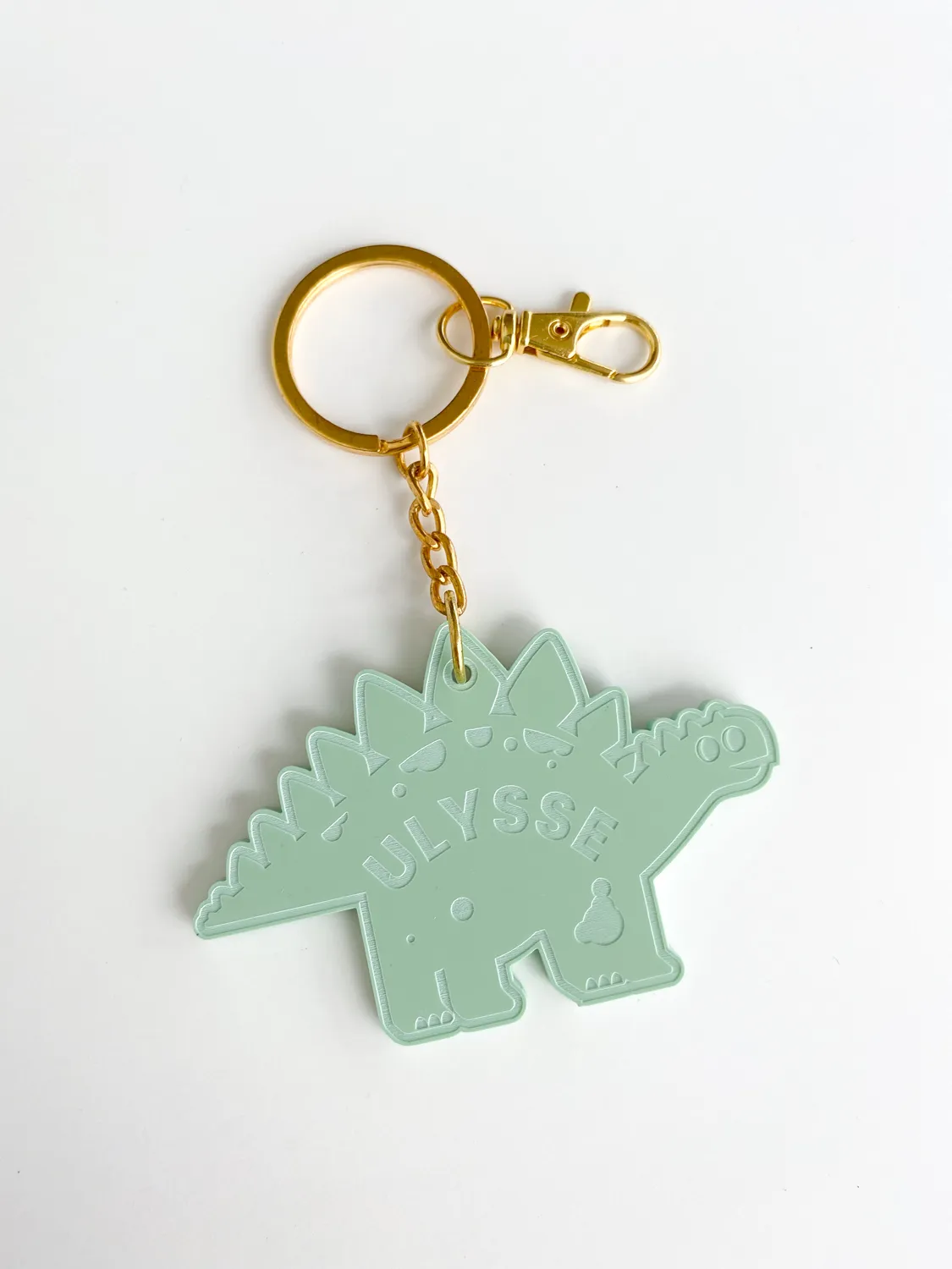 Un porte-clé coloré en forme de Dinosaure ! C’est certain avec lui vous n’oublierez plus jamais vos clés ! Il est à personnaliser avec un prénom au recto. Vous avez aussi la possibilité de graver un numéro de téléphone ou autre au verso (3 lignes max). Disponible dans les coloris jaune, rose, orange, vert et violet. Délais de fabrication : 2 à 3 jours Livraison : 72h en lettre suivie Matériaux : Acrilyque – anneau en laiton doré Dimensions : 5,5×5 (anneau 3cm Ø)