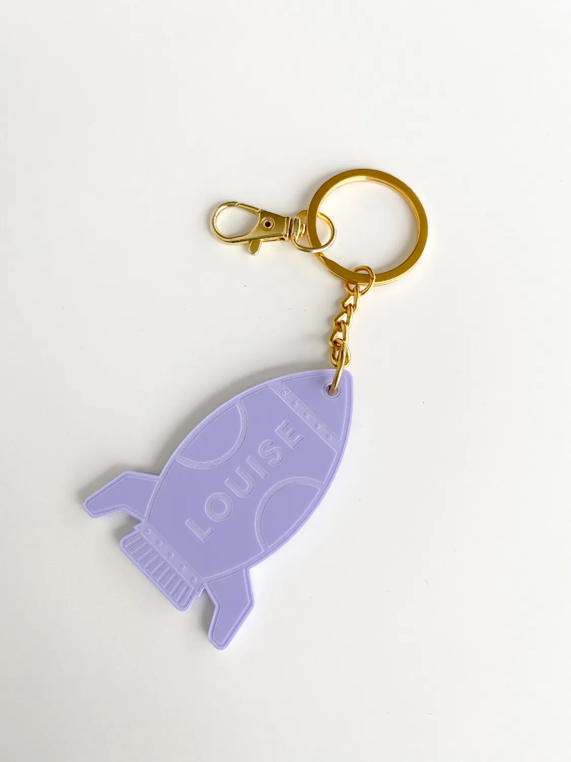 Un porte-clé coloré en forme de Fusée ! C’est certain avec lui vous n’oublierez plus jamais vos clés ! Il est à personnaliser avec un prénom au recto. Vous avez aussi la possibilité de graver un numéro de téléphone ou autre au verso (3 lignes max). Disponible dans les coloris jaune, rose, orange, vert et violet. Délais de fabrication : 2 à 3 jours Livraison : 72h en lettre suivie Matériaux : Acrilyque – anneau en laiton doré Dimensions : 5,5×5 (anneau 3cm Ø)