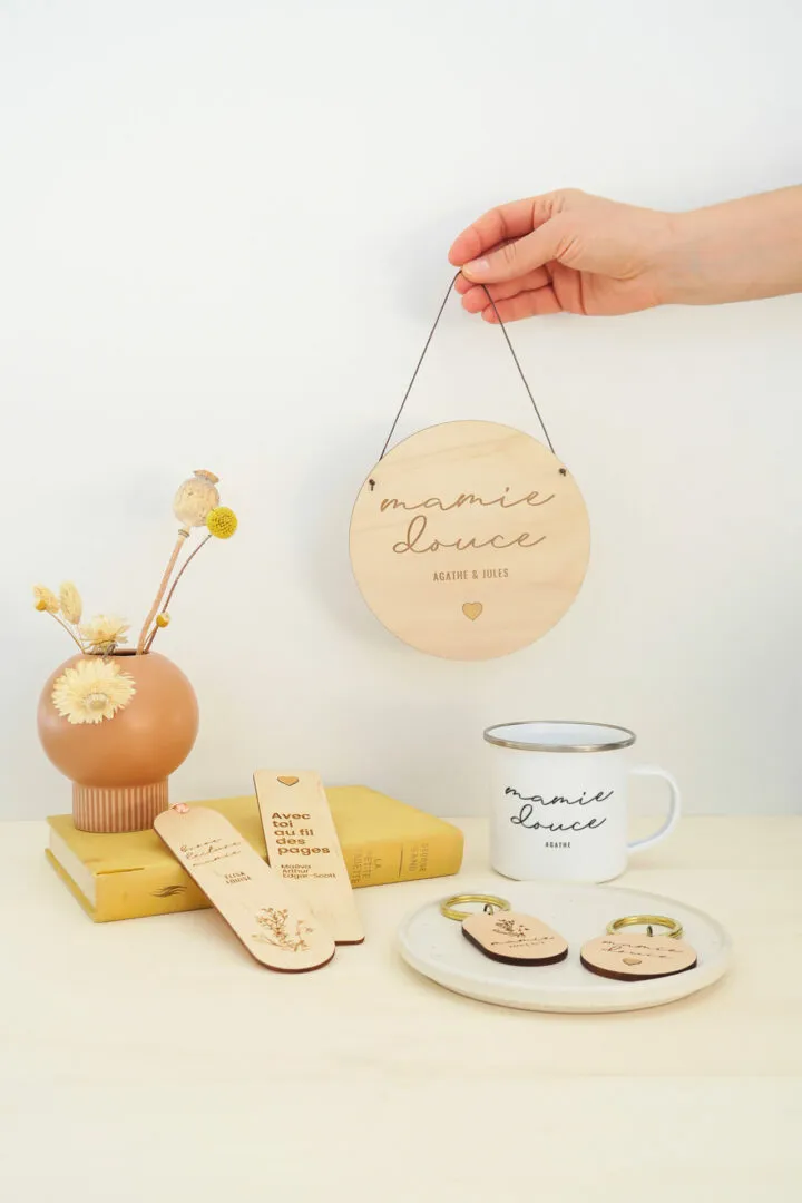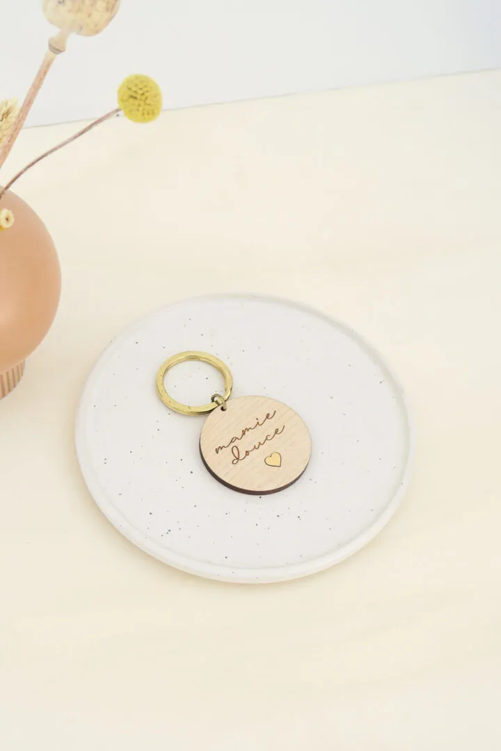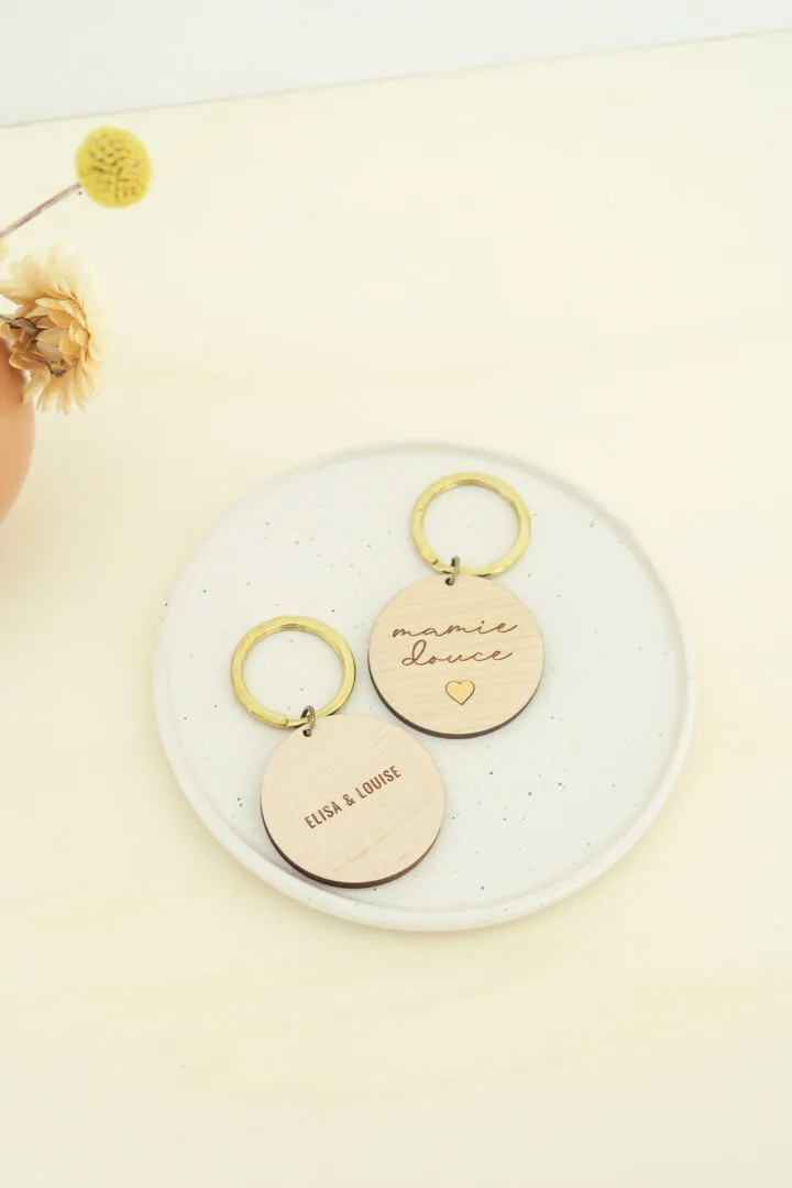 Porte-clés décoratif “mamie douce”, à personnaliser avec le(s) prénom(s) de(s) petit(s) enfant(s). Délais de fabrication : 2 jours Livraison : 72h en lettre suivie Matériaux : bois d’érable – anneau en laiton doré Dimensions : rond – ∅ 0,5cm
