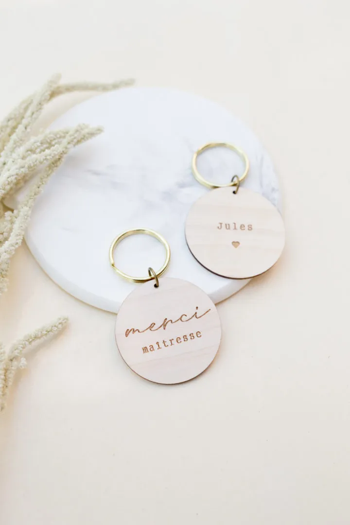 Porte-clés décoratif « merci » avec une gravure personnalisée au prénom de votre.vos enfant.s au verso afin de remercier celles et ceux qui se sont occupés de votre progéniture tout au long de l’année scolaire. Délais de fabrication : 2 jours Livraison : 72h en lettre suivie Matériaux : bois d’érable – anneau en laiton doré Dimension : rond (Ø 5cm)