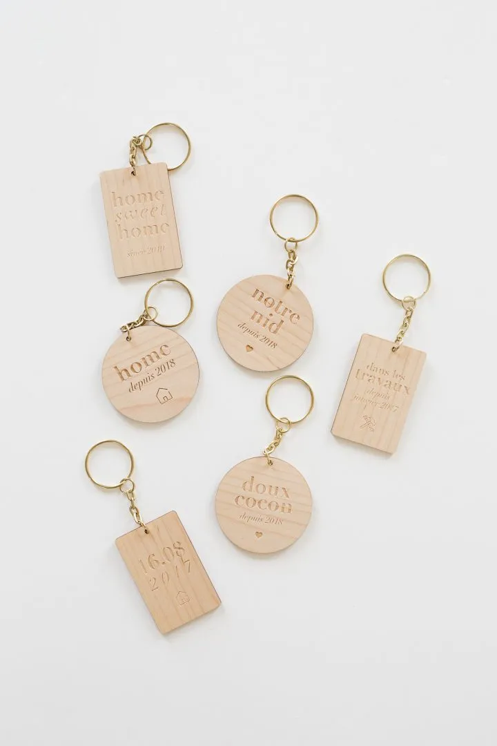 Porte-clés décoratif pour marquer le début de la grande aventure avec votre maison, à personnaliser de votre date, à porter tous les jours sur soi. Matériaux : bois d’érable – anneau en laiton doré Dimensions : rond – Ø 5cm Délais de fabrication : 2 jours Livraison : 72h en lettre suivie