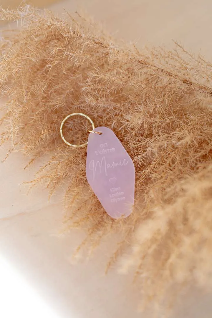 Porte-clés décoratif “On t’aime Mamie”, à personnaliser avec les prénoms des petits enfants. Délais de fabrication : 2 jours Livraison : 72h en lettre suivie Matériaux : Acrylique Rose translucide – anneau en laiton doré Dimensions : 8x4cm (anneau 3cm Ø)