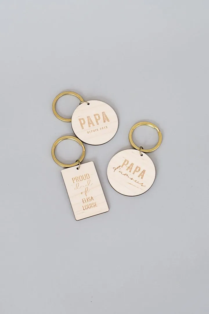 Les Porte-clés « Proud Dad of » font partis de la collection « PAPA : Porte-clés décoratif pour les papas à emporter partout avec soi, avec la date de naissance, les prénoms de ses enfants ou tout simplement un « papa d’amour » ! Trois design au choix pour un papa moderne. Délais de fabrication : 2 jours Livraison : 72h en lettre suivie Matériaux : bois d’érable – anneau en laiton doré Dimension : 5,5×3,5 cm