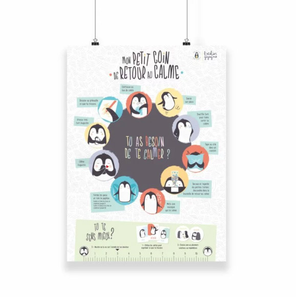 3 ans et + Ce joli poster propose à votre enfant des solutions pour l’aider à retrouver son calme. Vous y trouverez 13 suggestions d’Augustin le pingouin, pour l’aider à s’apaiser face à une situation  de stress, d’agitation ou d’émotions difficiles à gérer. C’est un support concret pour l’encourager à trouver les ressources qui lui font du bien, par lui-même.