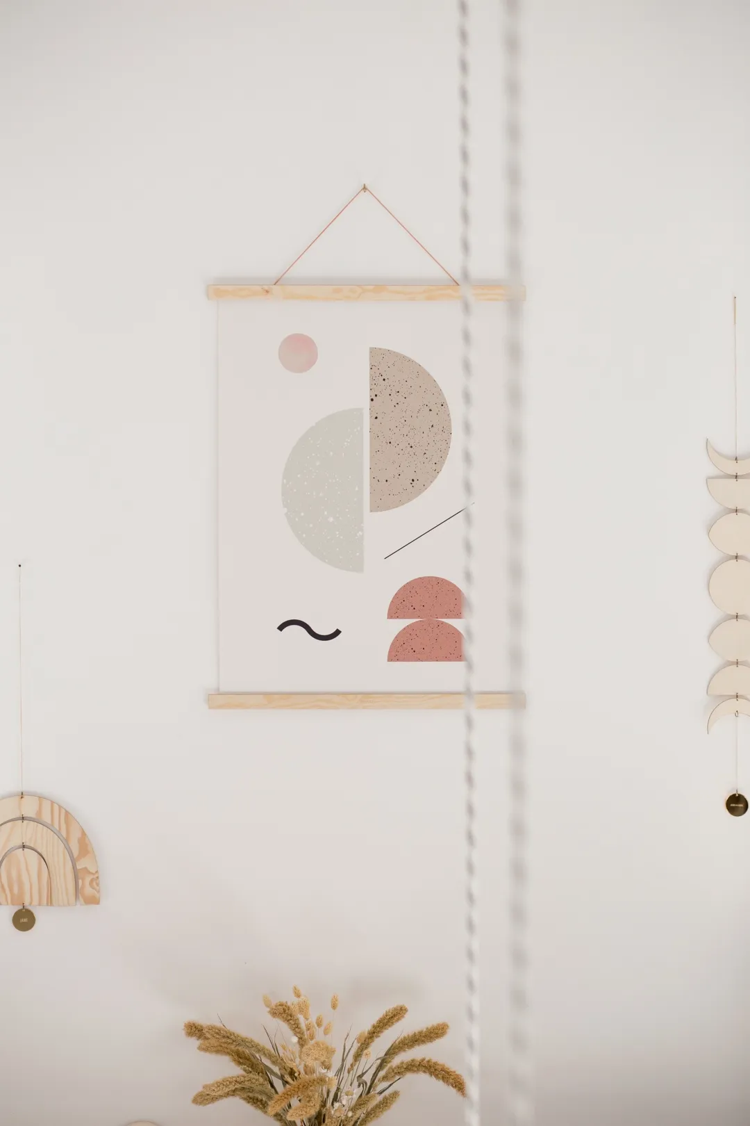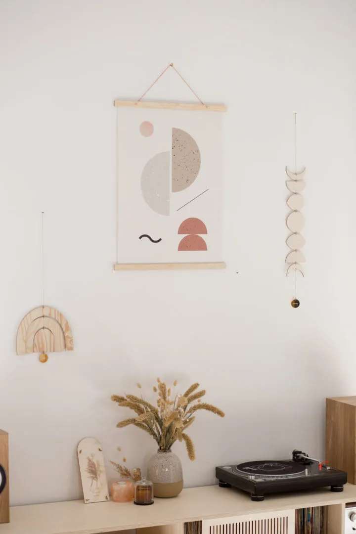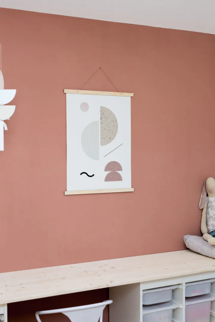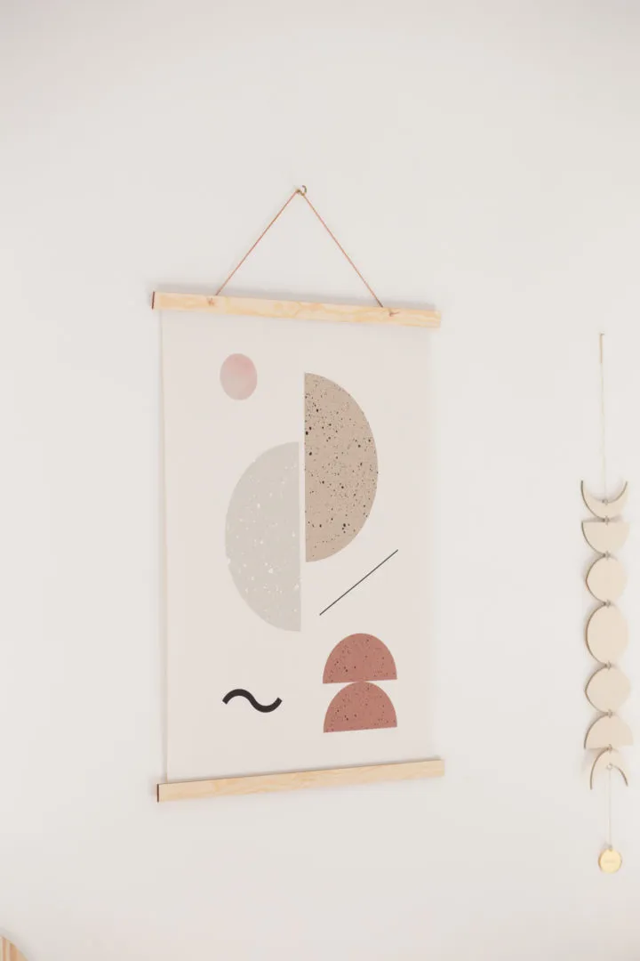 Composé de deux baguettes de support en bois, cette affiche peut habiller un mur aussi bien dans une chambre d’enfant que dans un salon.