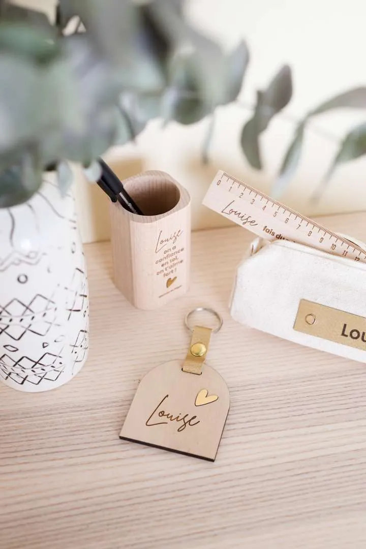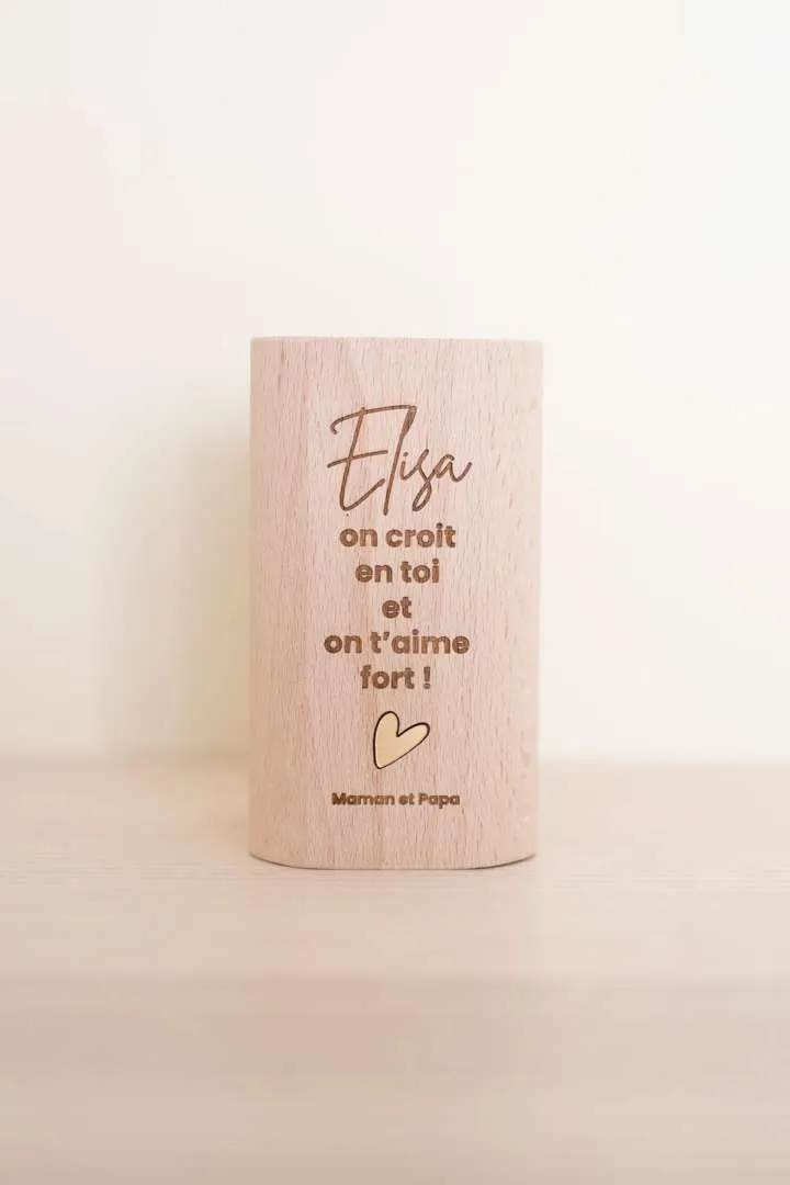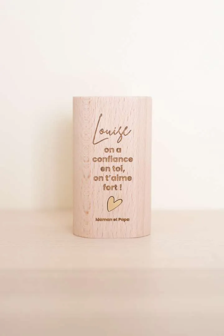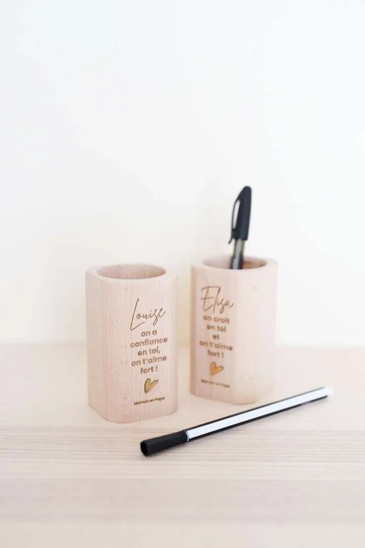 Notre pot à crayons avec sa petite phrase motivante est parfaite pour se poser sur le coin du bureau de votre écolier et lui donner du courage pour faire ses devoirs ! 2 phrases au choix à personnaliser du prénom de votre enfant. Bois de hêtre Certifié FSC 9,5cm x 5,5 cm Ø 4,5 cm (ouverture) Fabrication : 3 à 4 jours ouvrés – Livraison : 24h en colissimo