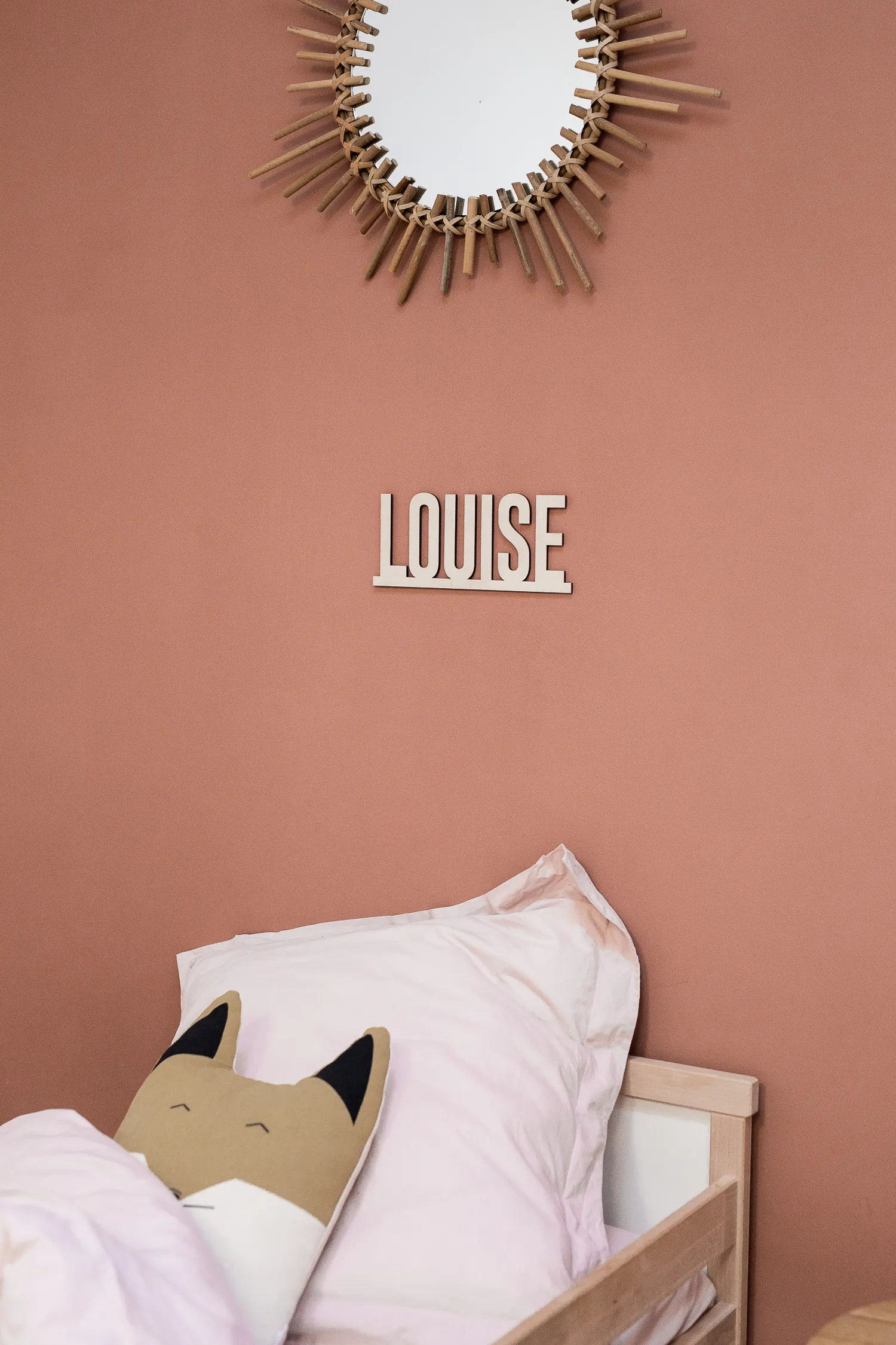 Petit objet décoratif au prénom de votre enfant pour décorer sa chambre. Un adhésif est prévu au verso du prénom pour faciliter la pose. Dim : environ 15×34 cm (jusqu’à 7 lettres) environ 15×40 cm (plus de 7 lettres) Matière : Bois Peuplier 4mm Délais de fabrication : 5 à 7 jours ouvrés Livraison : 48h en colissimo