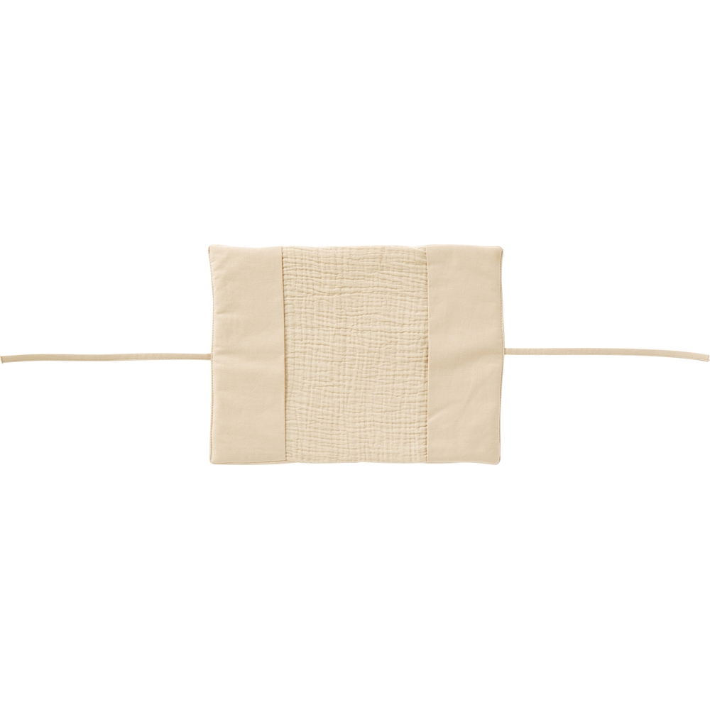Rabats à l’intérieur et liens à nouer sur le côté. Broderie « Mon carnet de santé » sur le devant.