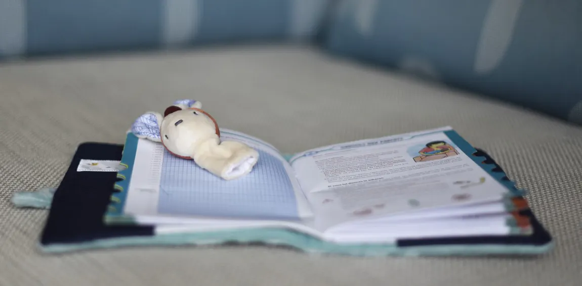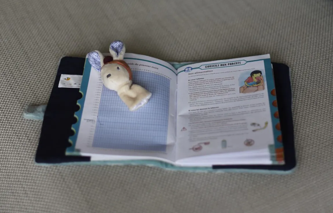 Un protège carnet de santé tout doux avec une marionnette de doigt sur la couverture