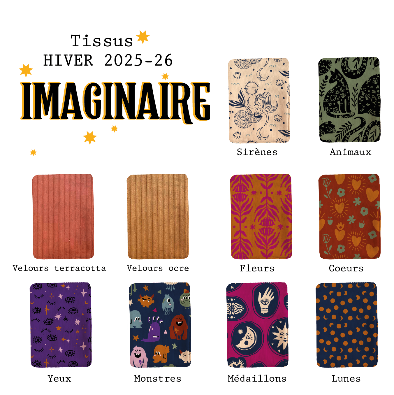 | Tissus | Animaux, Coeurs, fleurs, Lunes, Médaillons, Monstres, Sirènes, Velours côtelé ocre, Velours côtelé terracotta, Yeux |