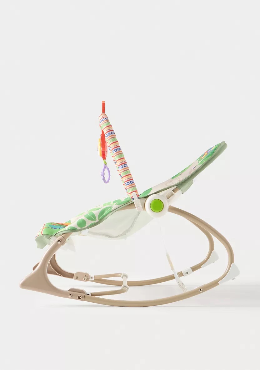 Transat évolutif, suit la croissance de bébé. Pour les nourrissons, lorsqu’il est incliné et muni de la béquille dépliable, il sert aux heures de repas ; une fois redressé, il sert de balancelle. Plus tard, il se transforme en chaise à bascule. Divertissant, ce transat joue de la musique, possède une arche de jeux amovible l’un d’eux et musical ,il diffuse des vibrations apaisantes. Confortable : siège profond. Dés la naissance à 18kg