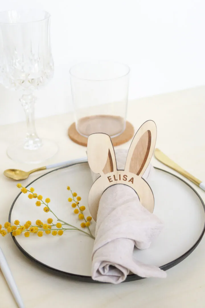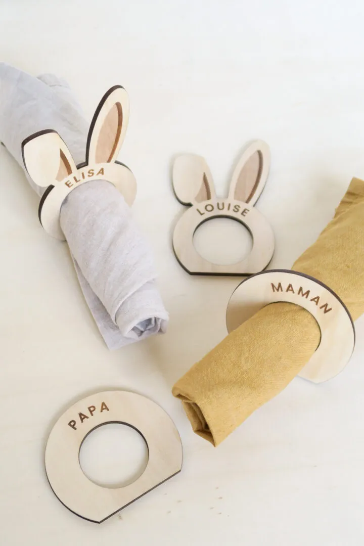 Fini les bavoirs, votre enfant grandit et a désormais sa propre serviette à table comme les grands ! Et pour rendre ce passage à table un peu plus fun pourquoi ne pas lui mettre un rond de serviette avec des oreilles de lapin avec son prénom gravé ? Testé avec nos jumelles à la maison, ce rond de serviette plait beaucoup à chaque repas ! Matériau : bois de peuplier 4mm Dimension : 4cm de diamètre et 12 cm d’hauteur d’oreilles. Fabrication : 48H Livraison : 72H en lettre suivie Nous vous livrons ce rond de serviette en…