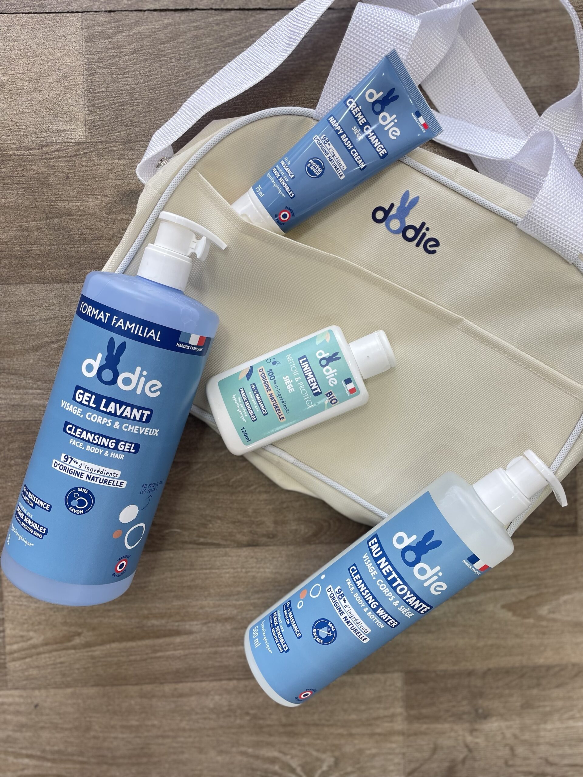Le sac des produits dodie pour vôtre bébé 👶🏻 – Gel lavant 1L (corps-cheveux-visage) -Eau nettoyante 500ml (visage-corps-siège) -Lininment 120ml -crème change 75ml (siège)